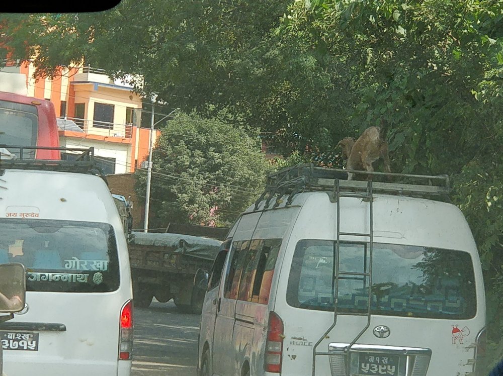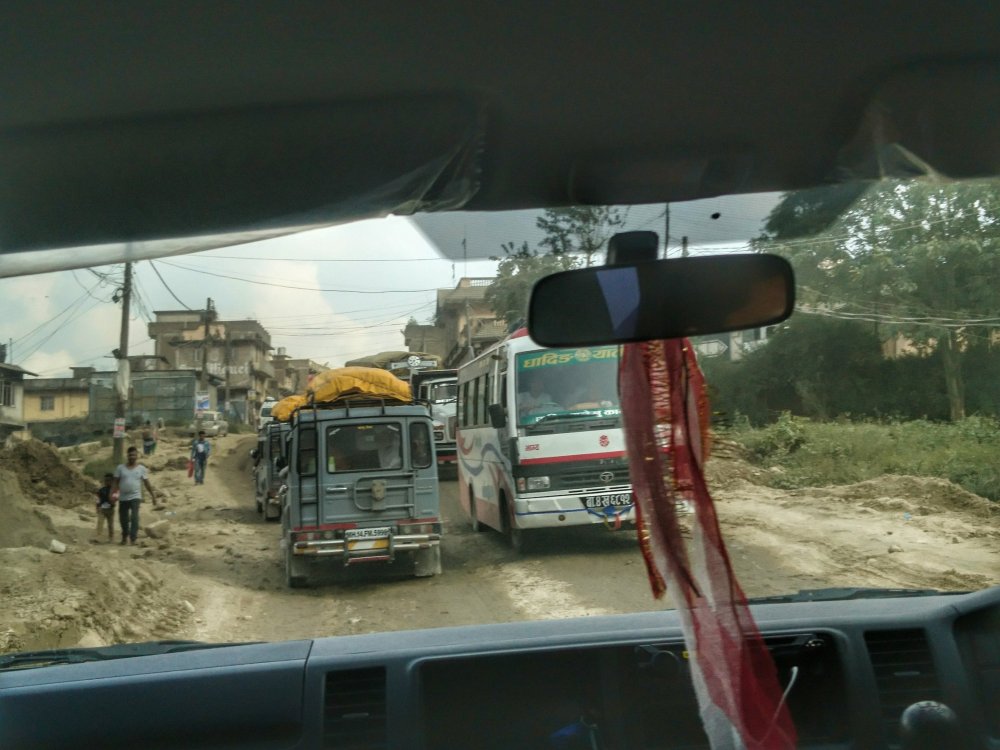 So just to re-iterate approx 100 miles…it took us 9hrs 30 minutes…did I say 9 hours 30 minutes! Think of the worst dusty, pot holed dirt track you can imagine, throw in a few thousand cars, buses, trucks, motorbikes, bicycles, people, cows, dogs, goats and chickens, times it by ten then you have your ultimate free for all – the road from Chitwan to Kathmundu…that’s all I’m saying!!!