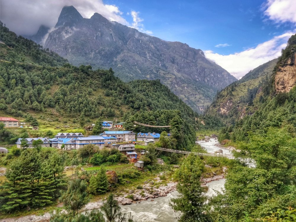 So after a fantastic day which involved a short 2hrs 30 mins trek through breathtaking scenery we reached our destination of Phakding, a beautiful hamlet sandwiched between mountains and river.