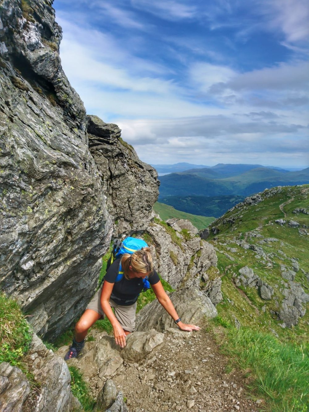 There are two summits to explore. We cross over to the main summit and it’s interesting pinnacle, an isolated tower of rock that provides just one way to ascend to the top – by threading the needle – this involves crawling through a hole in the rocks (Argyll’s Eyeglass) onto a narrow ledge then scrambling up to an exposed rock.