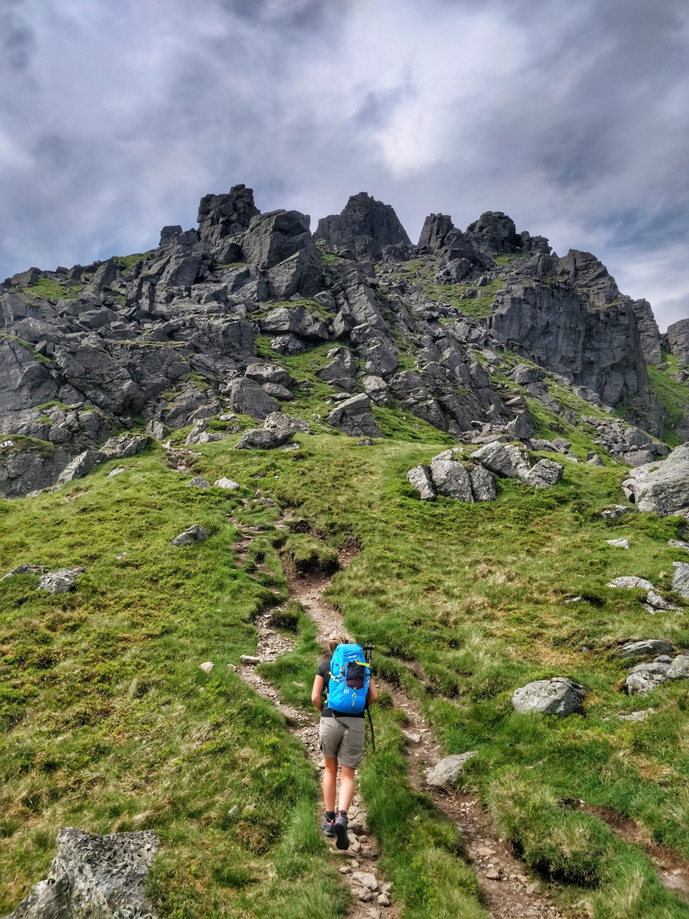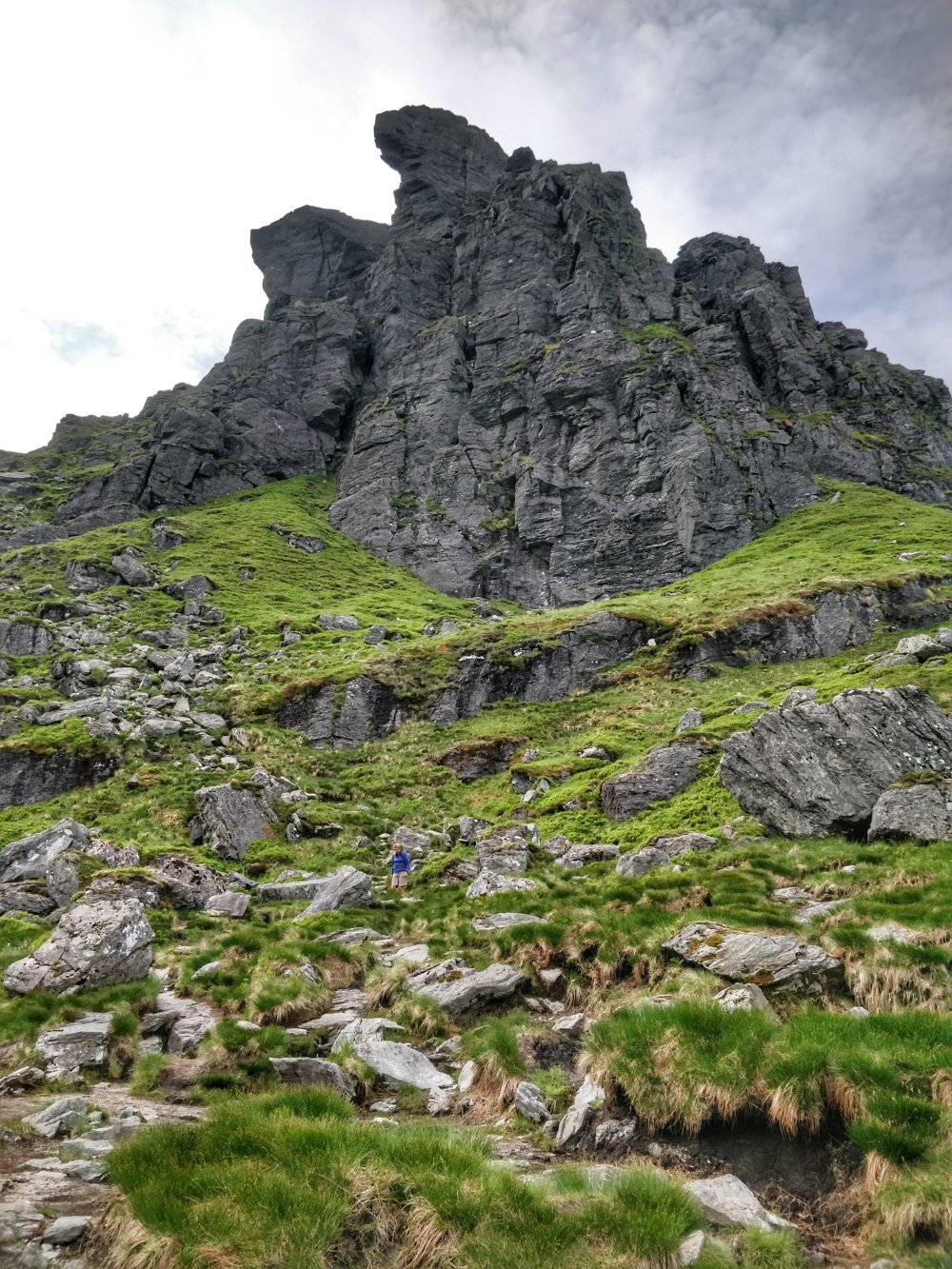 Once we got up to the upper section we could see ‘the spearhead’, a rock-slope failure has left this 20m craggy buttress and from where we were standing, it looked impassable.