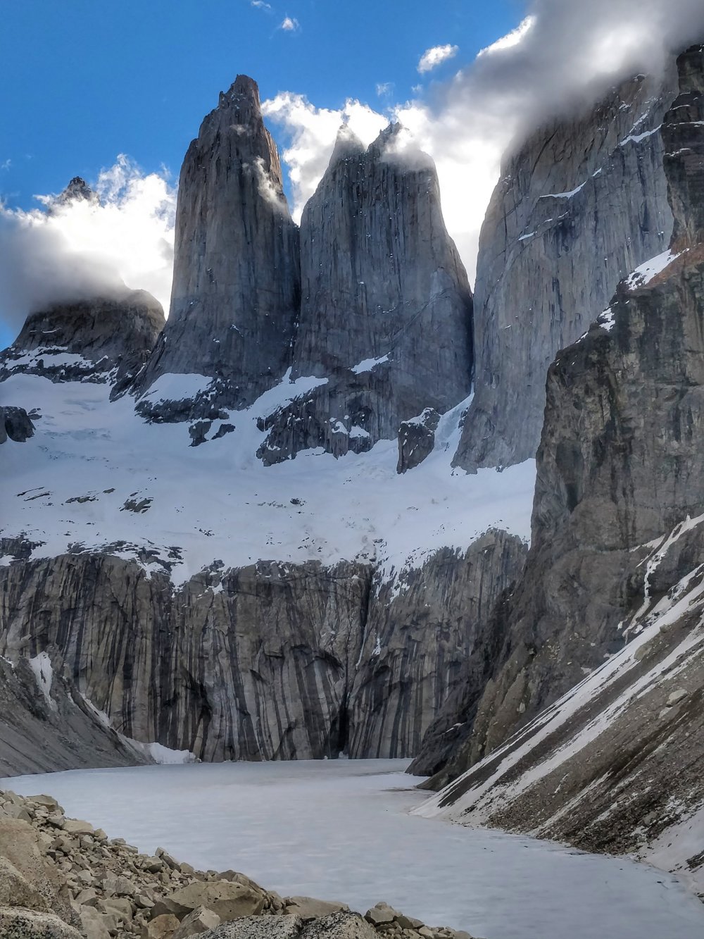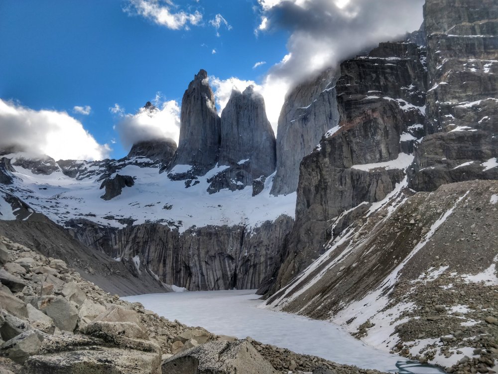 We witnessed some views, the 3 peaks of Torres Del Paine right there, and the lake at the bottom which is usually such a beautiful blue colour frozen over which just added to the perfection.