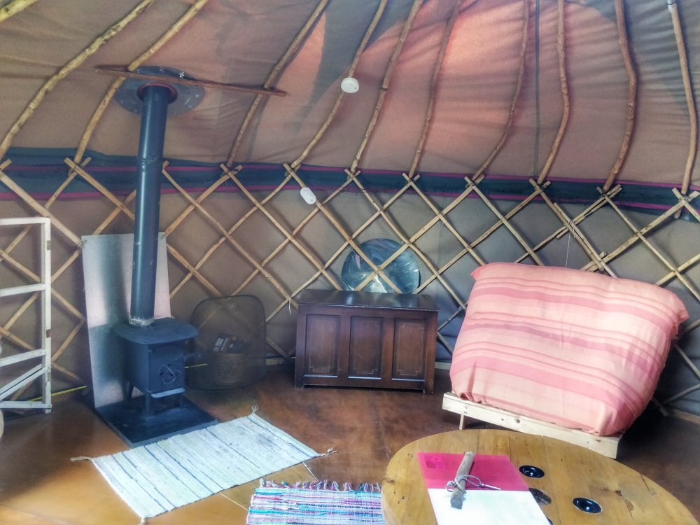 Inside we have a log burning fire, gas stove, futons to sleep on, a star gazing roof with fairy lights all around the walls inside should it get too dark which run off solar power….it’s all so perfect.