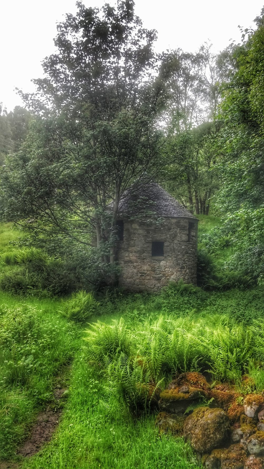 Eventually we were back on the gravel path and down came the rain heavily. We hurried as best we could but due to the state of the feet, the loose gravel under foot, it was not the quickest. We entered into the forest which was a huge relief as this meant we did not have far to go.