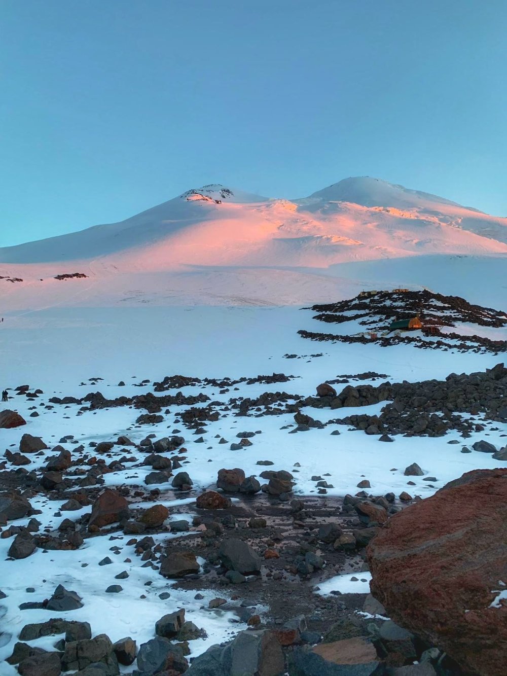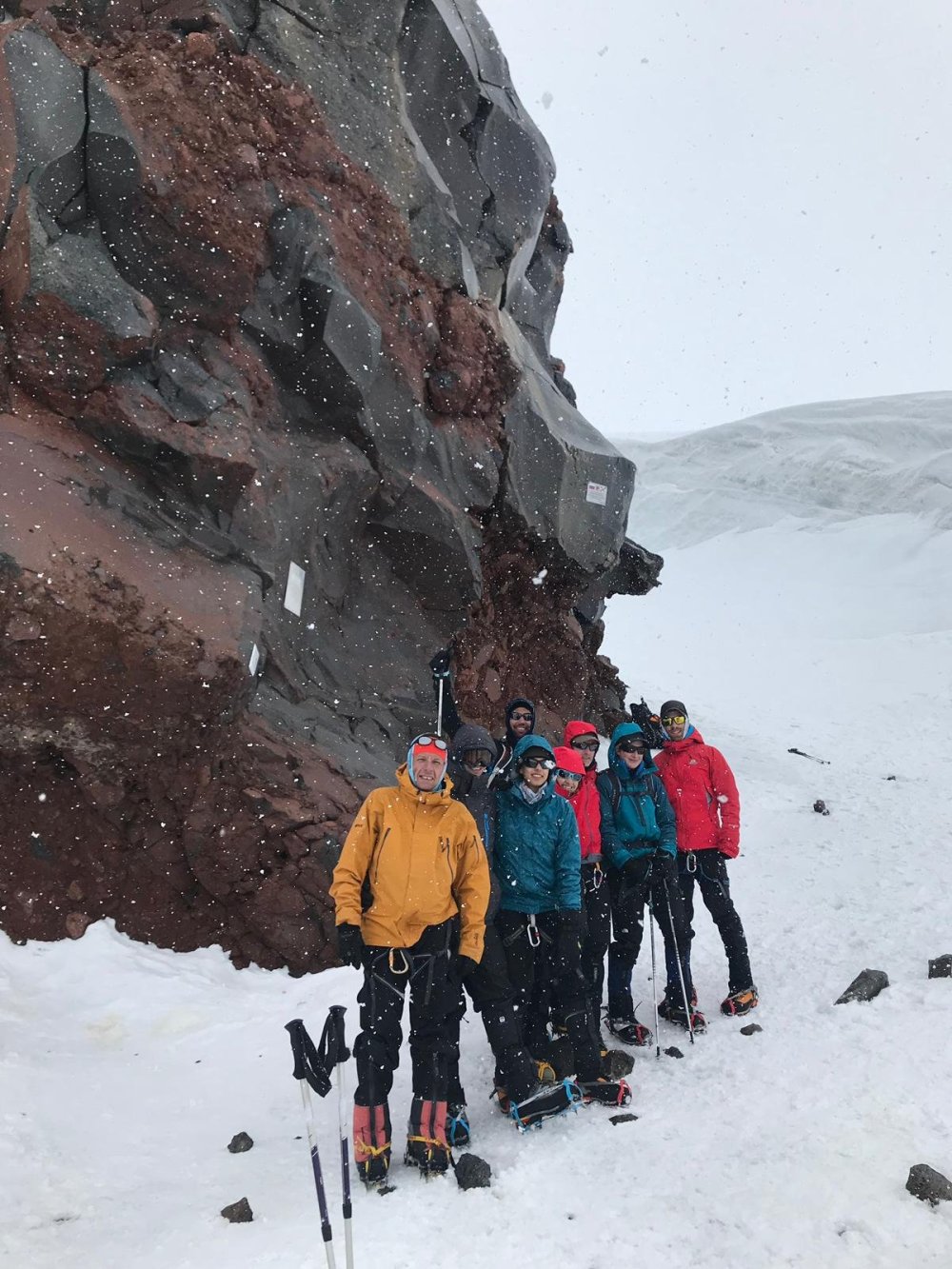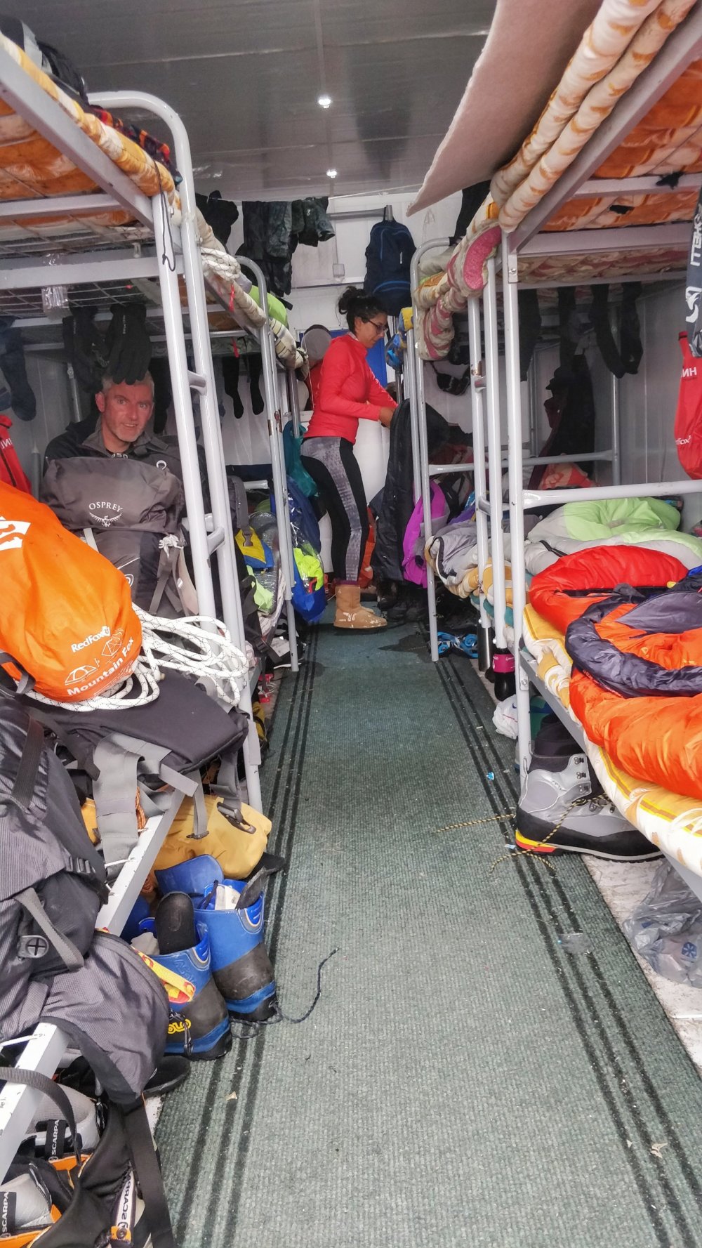 Pity you couldn’t ski down the mountain😜😜..Andy looked a bit better in the photo just hope you recover quickly. Have we seen your Rusdian guide yet?He seems to have you all under control. Amazing how the terrain changed so quickly one minute greenery and rocks then up into the snow line. Hope you are both feeling better and I must say you all look very cosy in your billets. Just waiting to see what happens when you reach the summit . Another portacabin or an igloo😄😄😄. Love /God Bless Aunty Alice xx