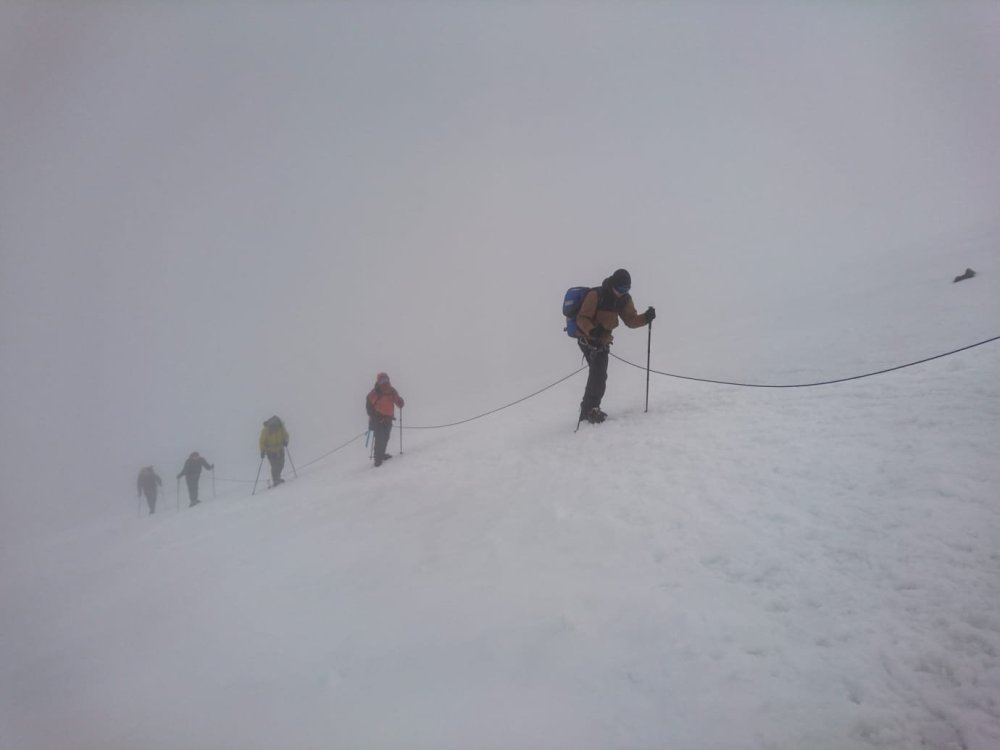 The ascent on snow was difficult and steep and in just over 4 hours we came to the lowest part of Lenz Rocks (4800m).