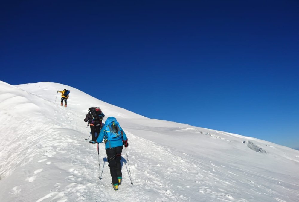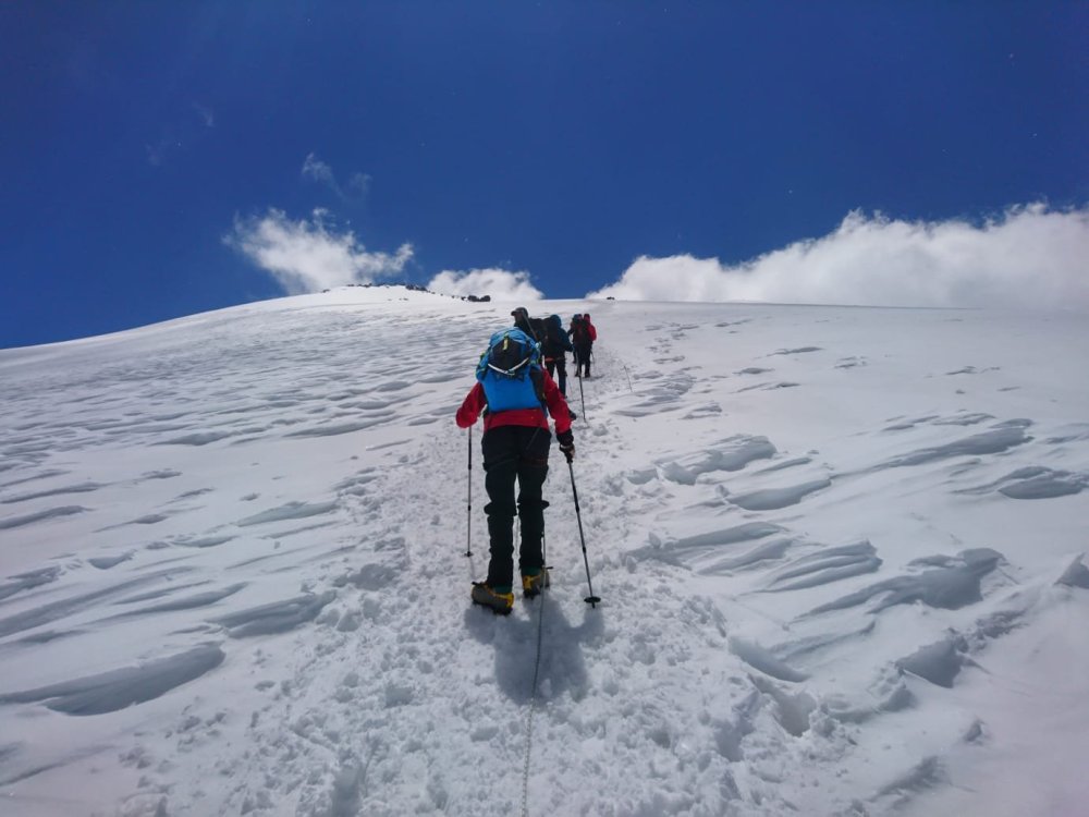 I preferred doing it in the dark as I couldn’t see how far we had gone. The ascent slope at this stage is already difficult and crosses the upper portion of the Mikelchiran Glacier and I knew from the previous times that it went on and on.