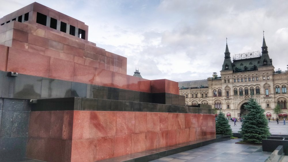 The embalmed body – or possibly a wax likeness – of this notorious 20th-century Russian leader is viewable inside this large stone mausoleum