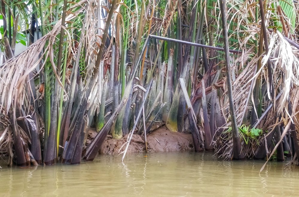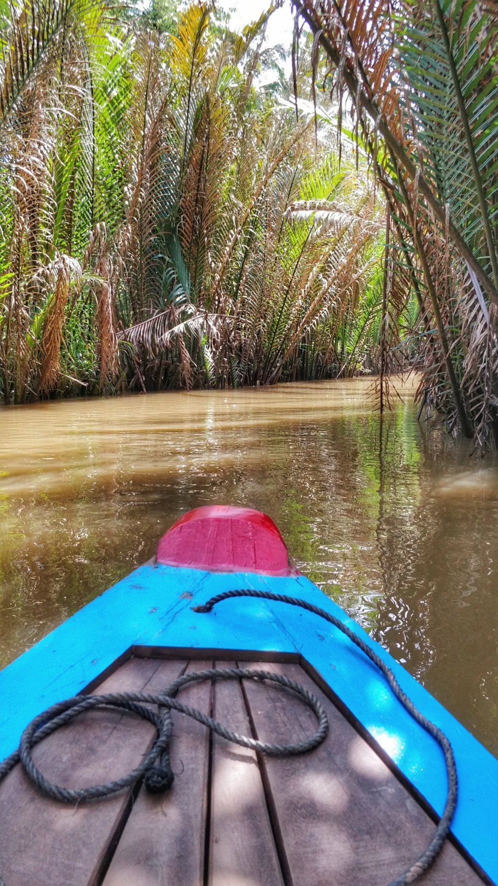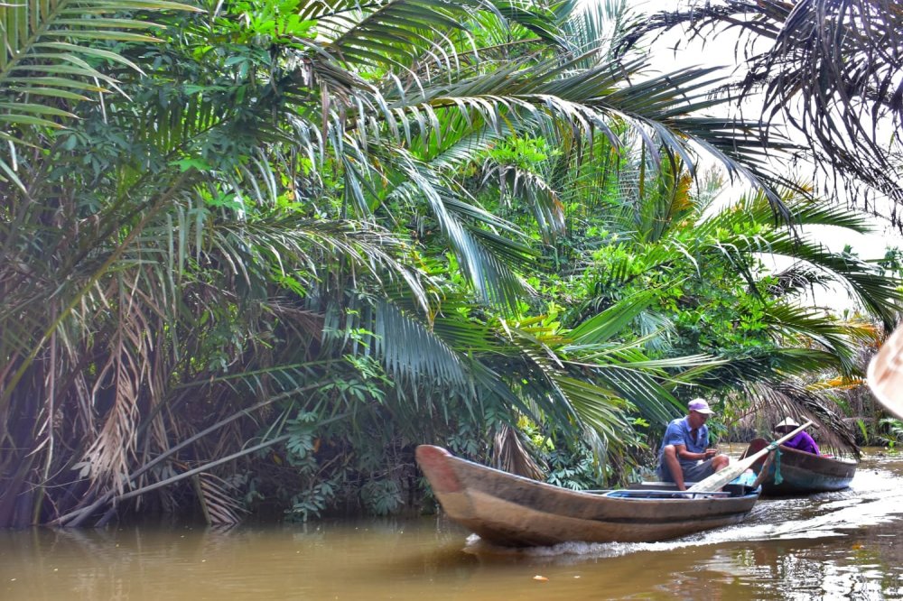 Further along we got to enjoy cruising on a hand-rowed sampan under the shadow of the water coconut trees along natural canals on the Mekong.