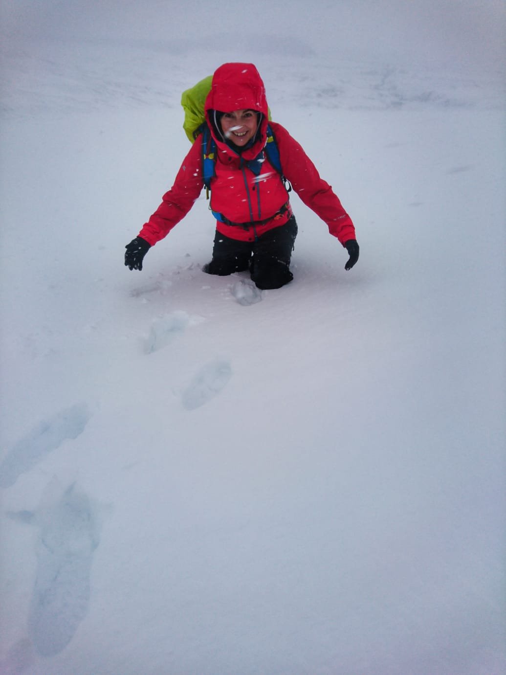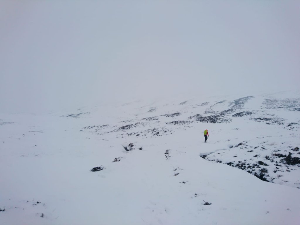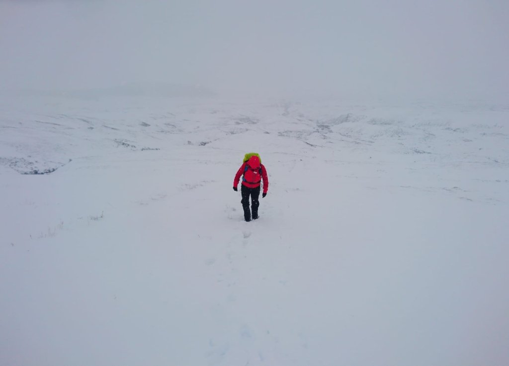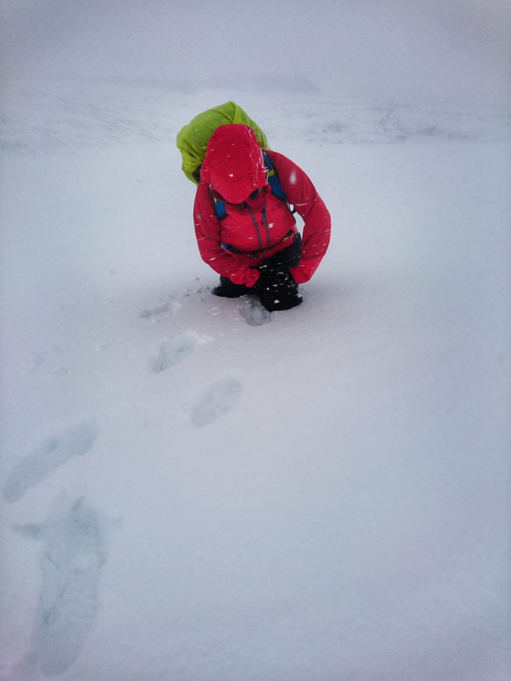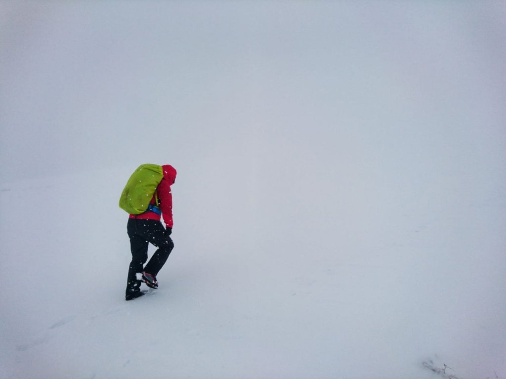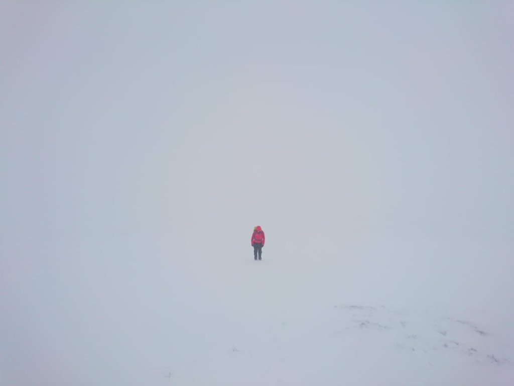 We kept moving slowly forward and upwards using GPS as the snow had masked any path, and with no visibility we had to make sure we were picking out the correct route past crags to reach the summit.