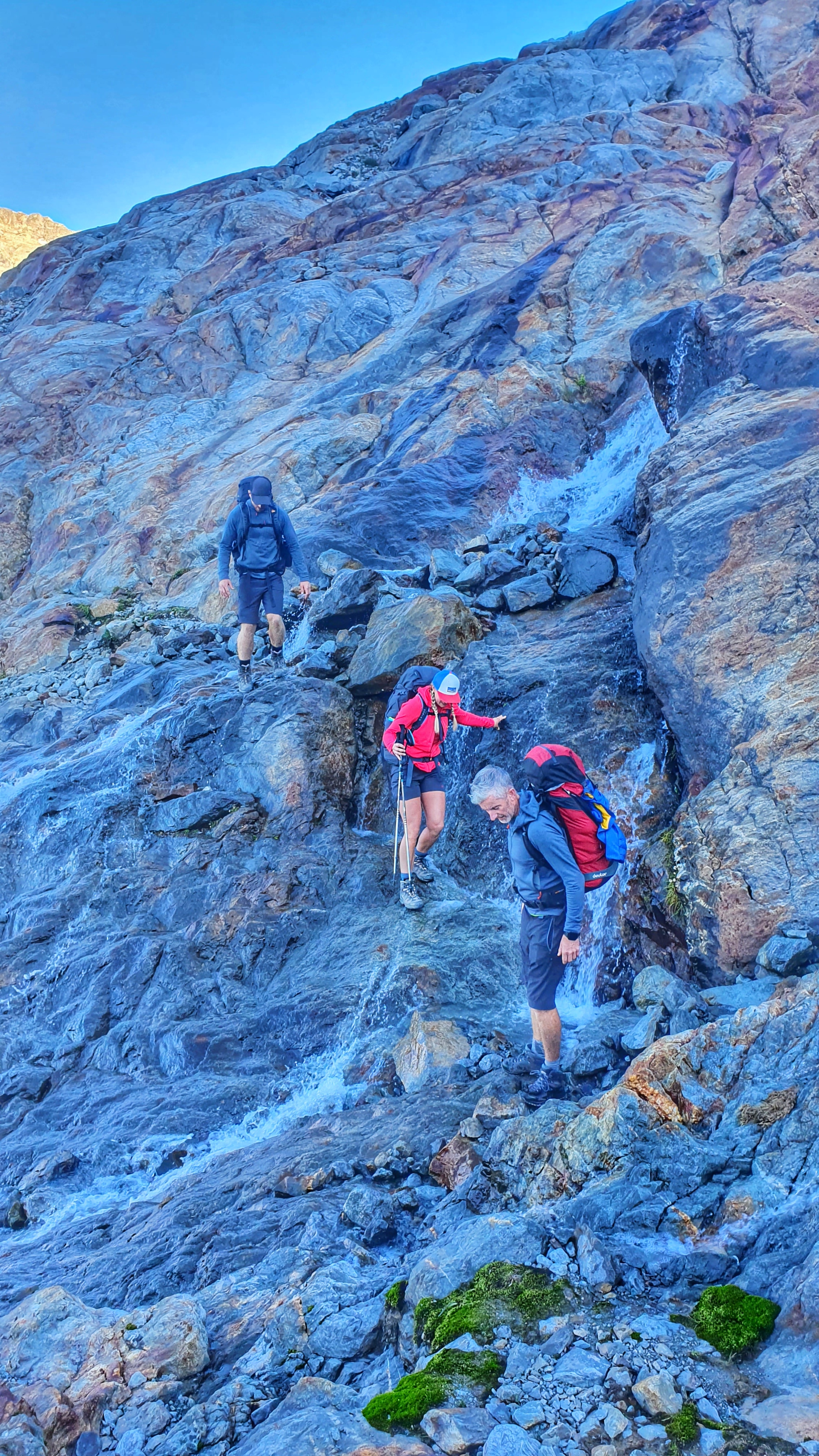 The track cuts across the base of the oddly named Glacier des Glaciers, with lots of rocks and gullies to cross, some requiring the use of handy chains and ropes to aid you.