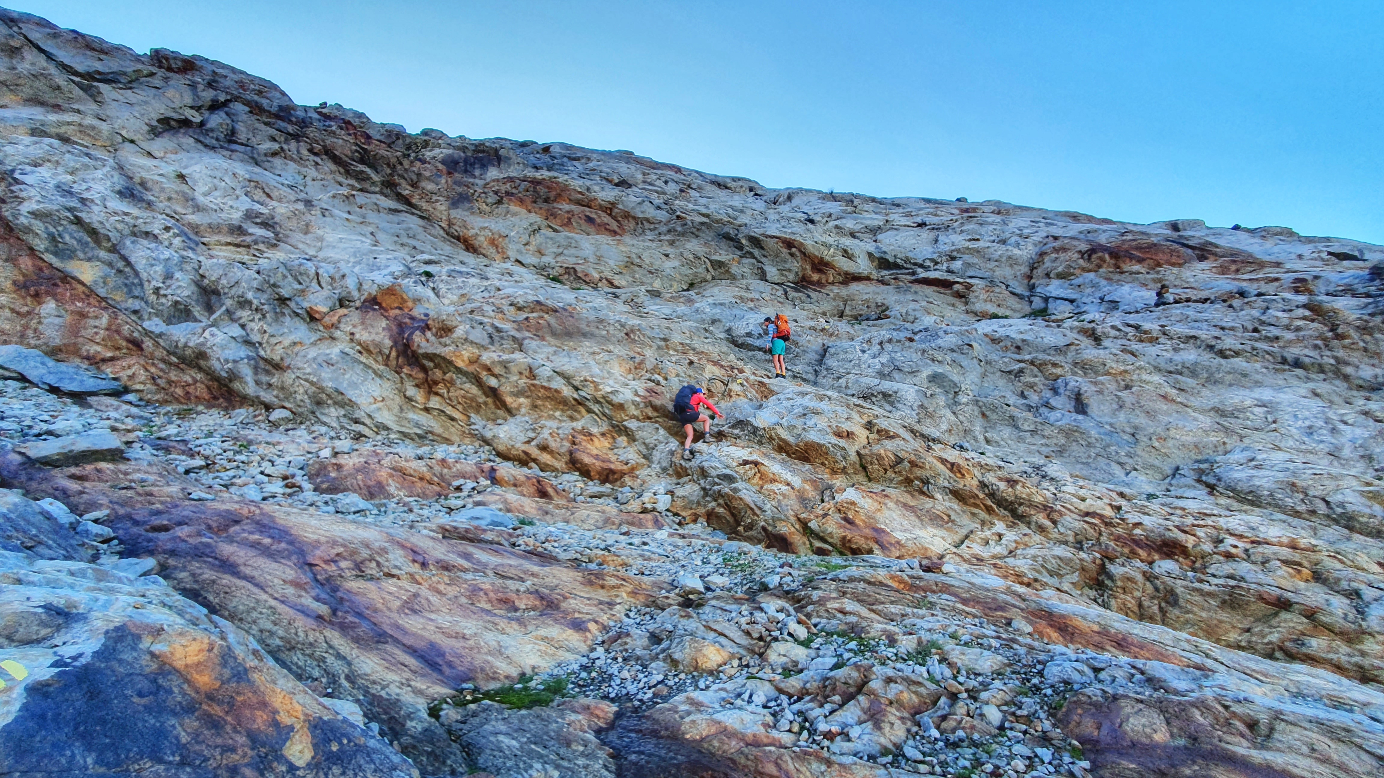 The gnarliest section was right at the end, above this striking zig zag track. Here there was just enough width on each ledge for a boot, and a rather large drop off below, so they’ve installed what felt like about 100m of wire to hold on to.
