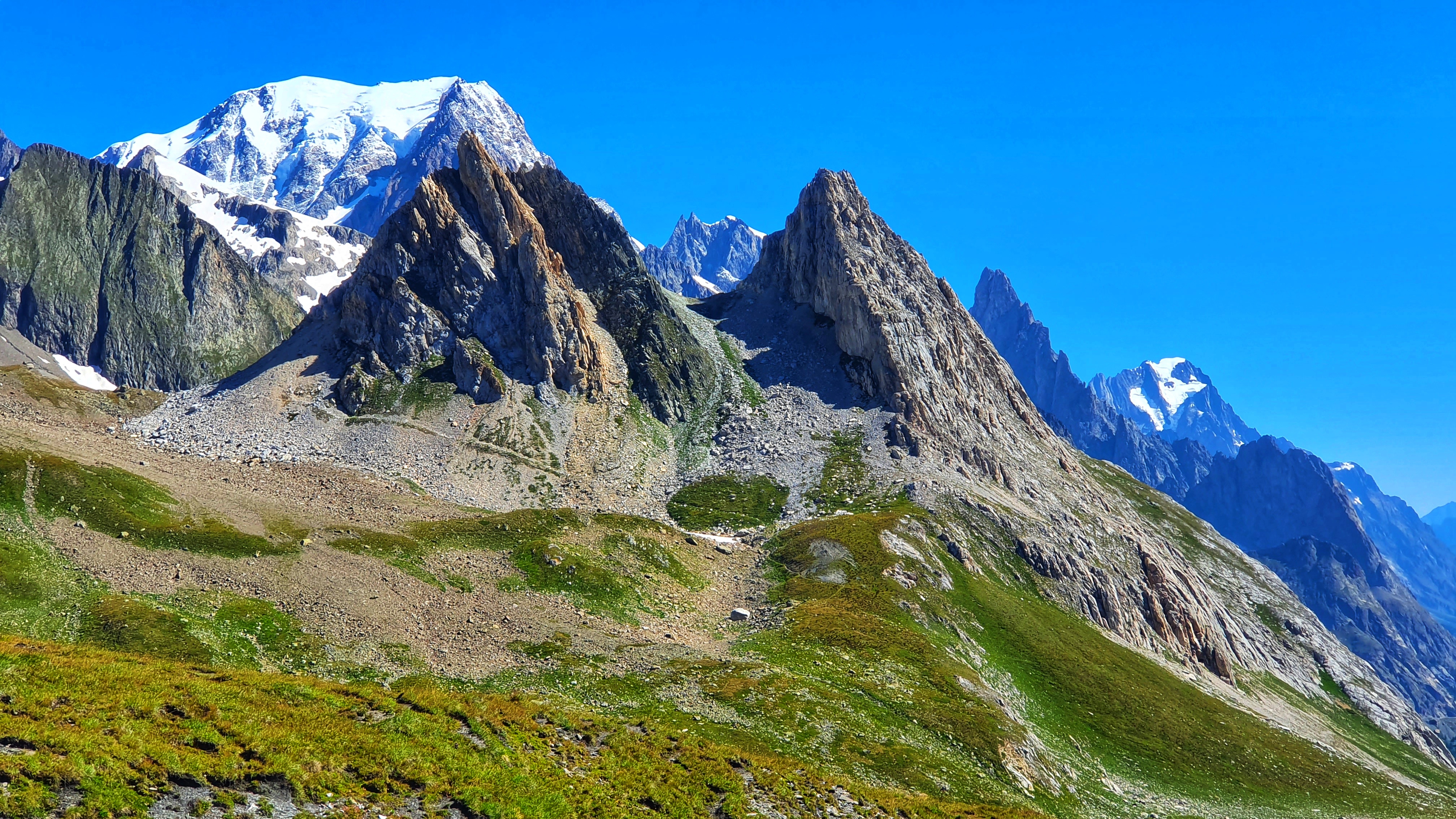 It was then a steady descent down enjoying great views of the Aiguilles of Peuterey as well as Mont Blanc.