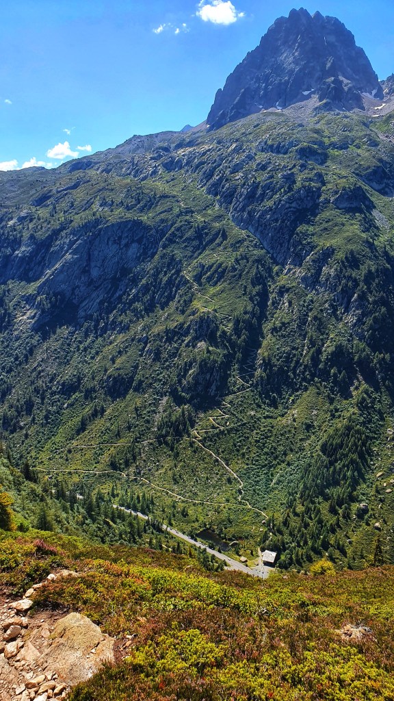 While admiring Mont Blanc and the Aiguilles Rouges we spotted our rather intimidating route tomorrow as it zig zagged up the mountain.
