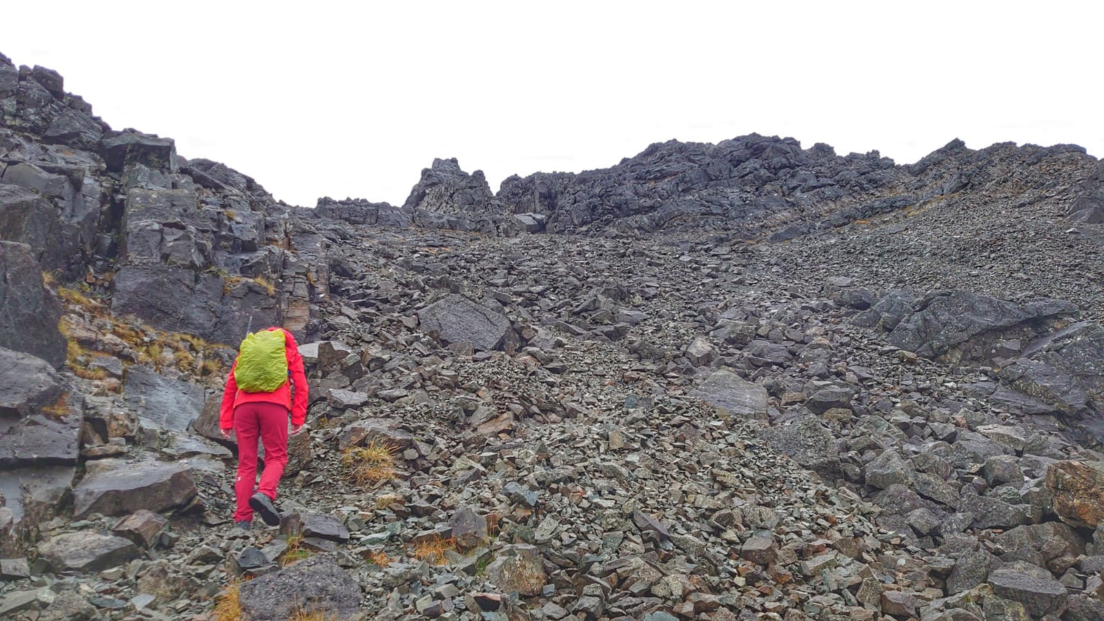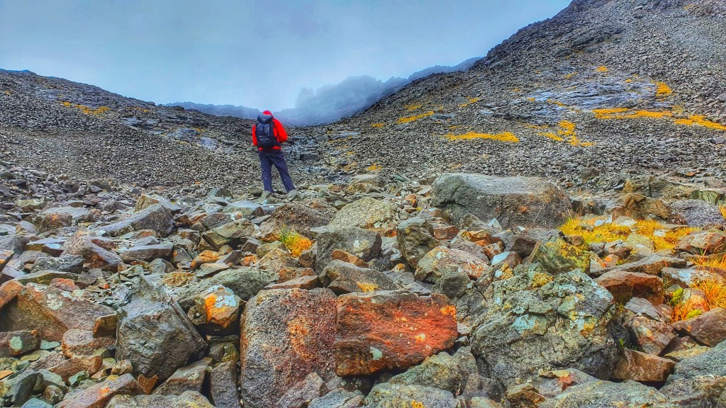We headed towards the back of the grassy bowl and began to head up an increasingly steep well-worn rough scree path that zig-zags up through boulders to reach the ridge at the Bealach na Lice between Bruach na Frithe, on our right, and Sgurr a’ Bhasteir, on the left.
