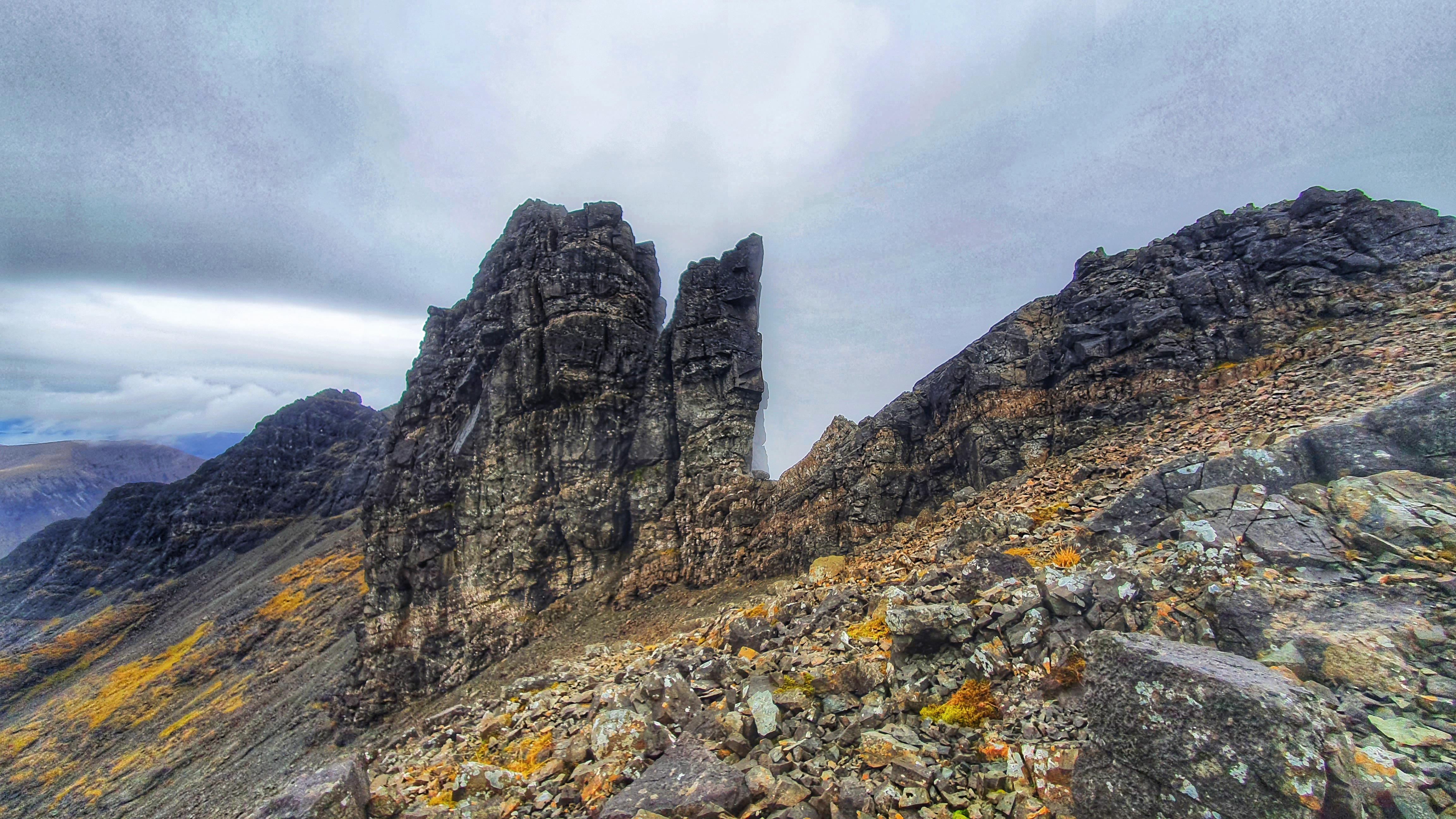 To the right of the tooth is the rock peak of Sgurr a Fionn Choire, which is less fearsome than the Tooth and can be traversed by scramblers.