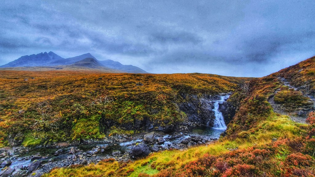 We climb at a reasonably easy gradient along the north side of the Allt Dearg Mor.  The rain started to fall lightly.  However there was some really beautiful waterfalls and pools which took our mind of the rain and added interest to the walk.