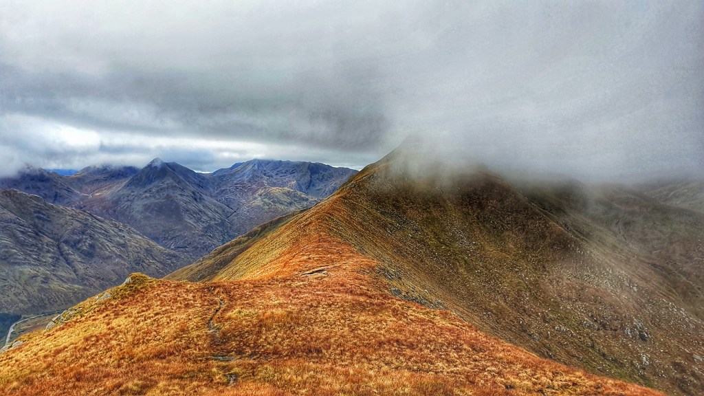 Next morning we were off to undertake The Five Sisters which is a classic ridgewalk taking in three Munro’s, a Munro Top and a Corbet. This hike would involve a long and wonderful days excursion with magnificent views on a clear day….today we had low atmospheric cloud…but sometimes this adds to the beauty.