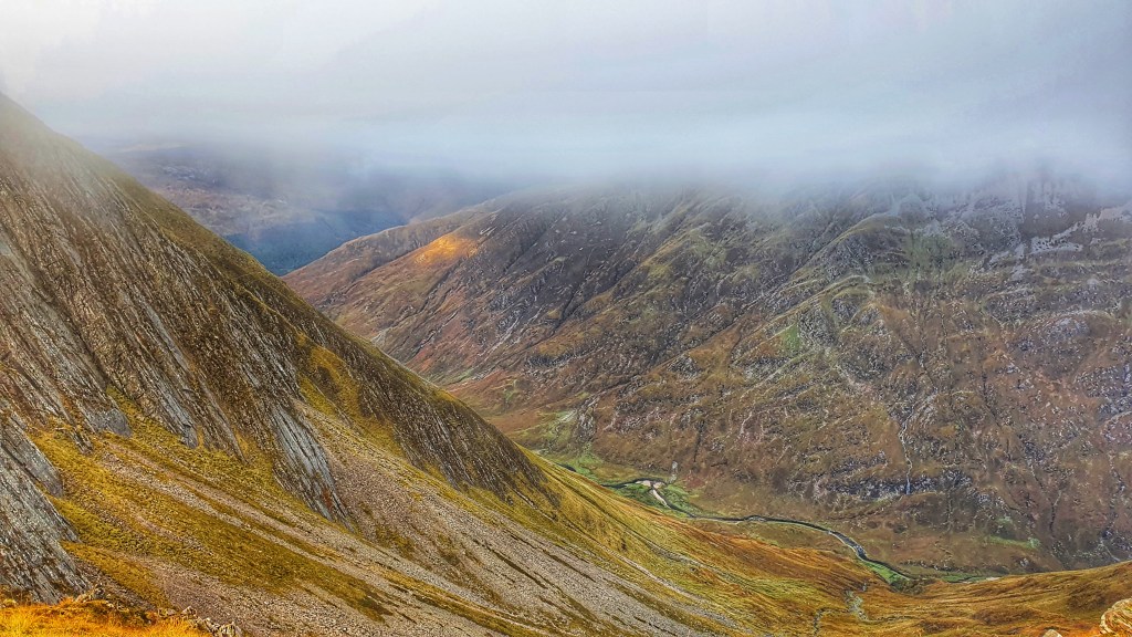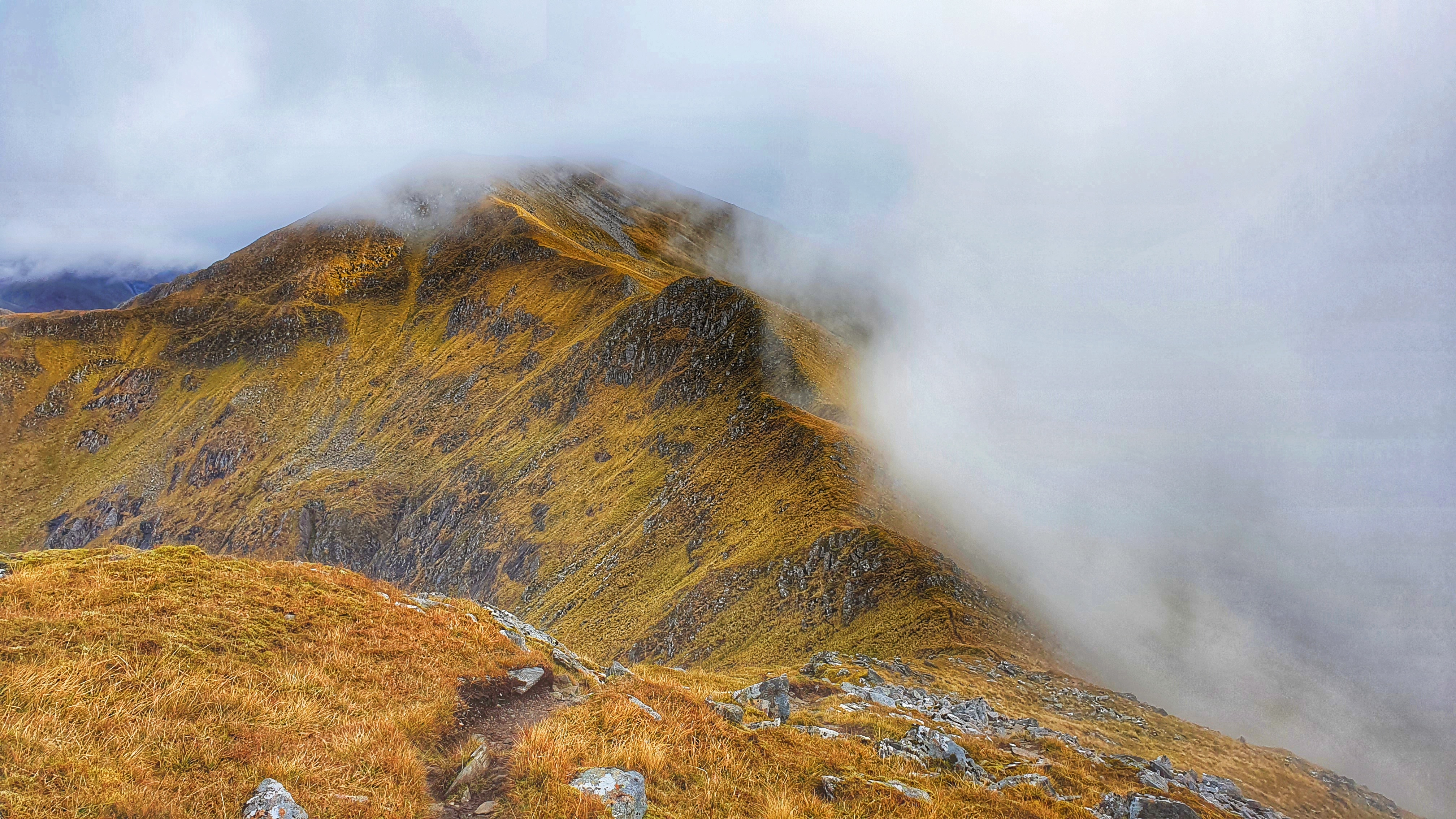 The views from the summit came and went and we saw numerous mountain tops and deep glens as the cloud hovered low around us.