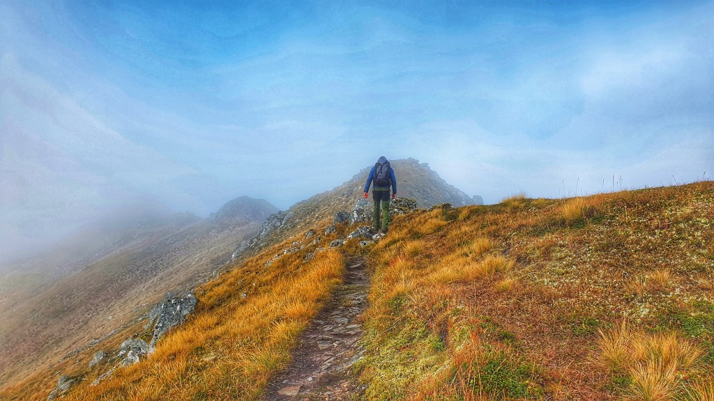 We started up on the same path as yesterday. Knowing that we had to undertake this very same , very steep, very wet and very muddy ascent as yesterday was a thought…and I was not looking forward to it…can you tell? However, I told myself that it was worth the effort as once on top it was a very different kind of hike and I had enjoyed yesterdays hike so much. So we began our climb once again, as one can expect from such a mountain that sits at sea level, the ridge walk cumulates a significant total ascent and descent…today however felt much better than yesterday, its amazing how a different mindset can affect things!