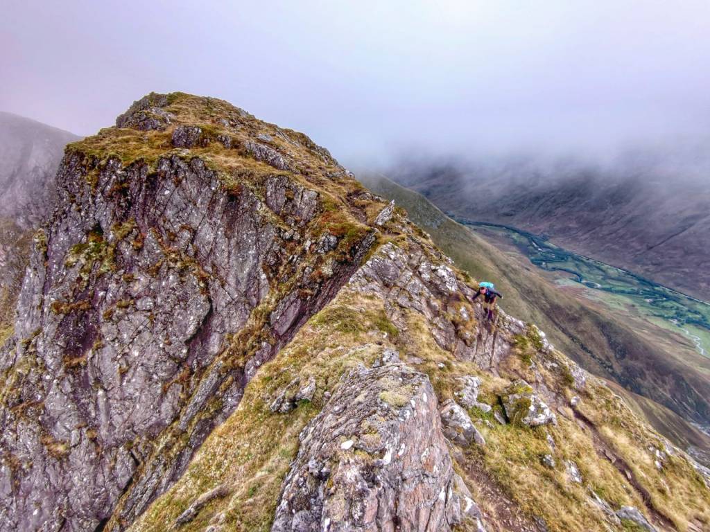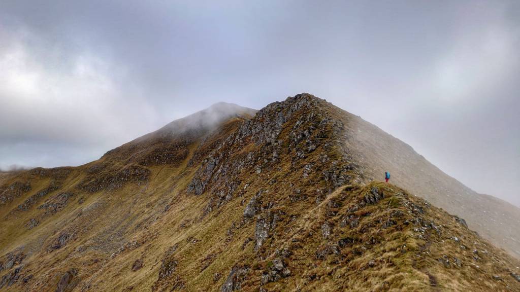 From here we continued along the ridge, it was a beautiful ridge walk, less defined than the Brothers Ridge yesterday with more steepness, roughness and lots more boulders and scrambling. It was more temperamental, edgy and exposed than the ‘Brothers’ but then again that can be said about a lot of ‘Sisters’ I guess! We continued down to the Bealach na Craoibhe.