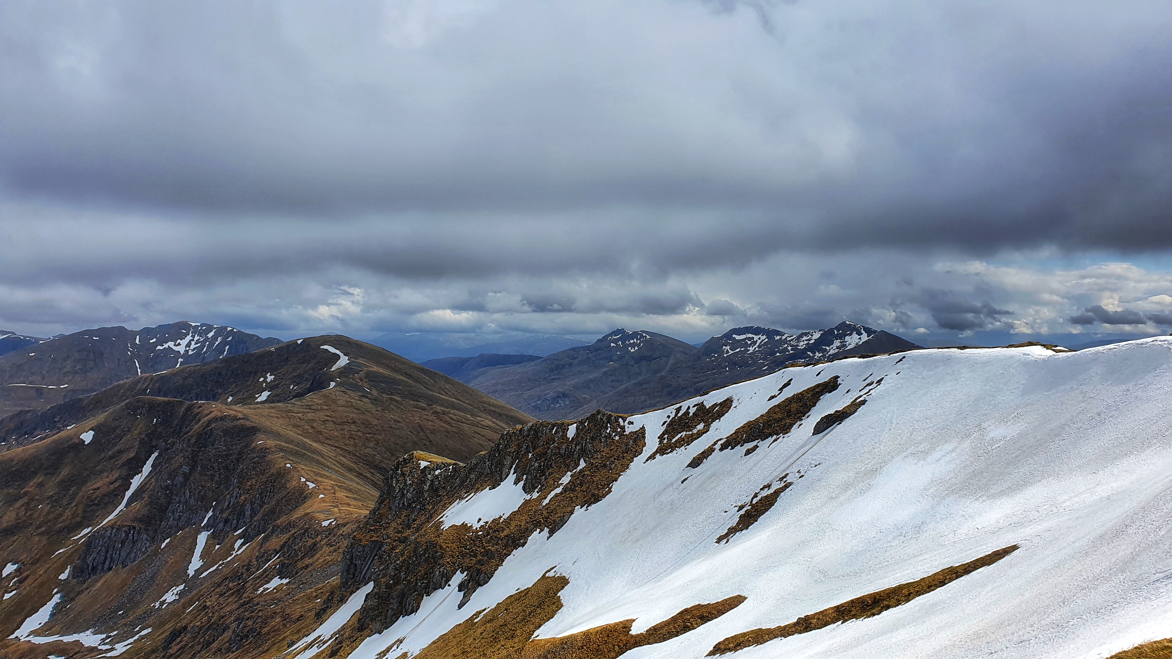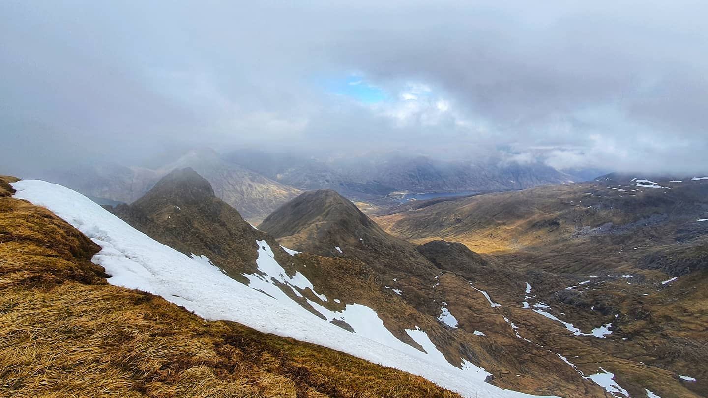 We plodded up and up and up until we eventually were in the low hanging clouds which clung to the top of this Munro. When we hit the summit large patches of snow were dotted all over.