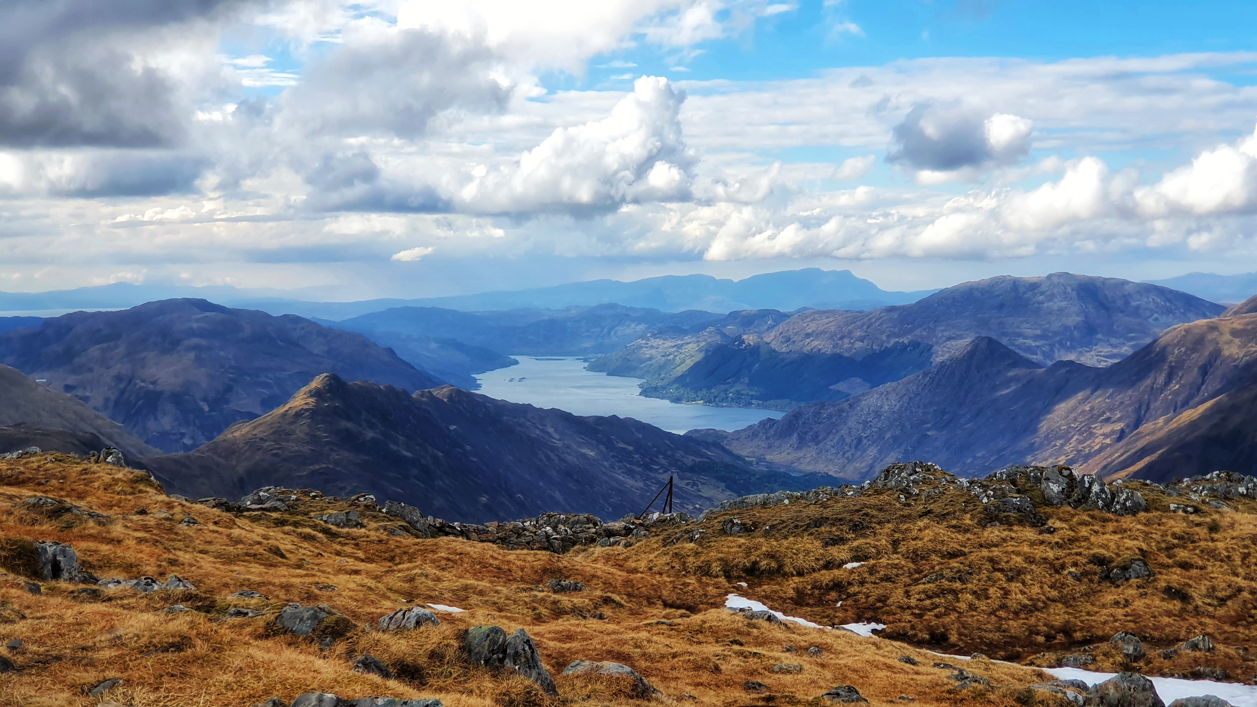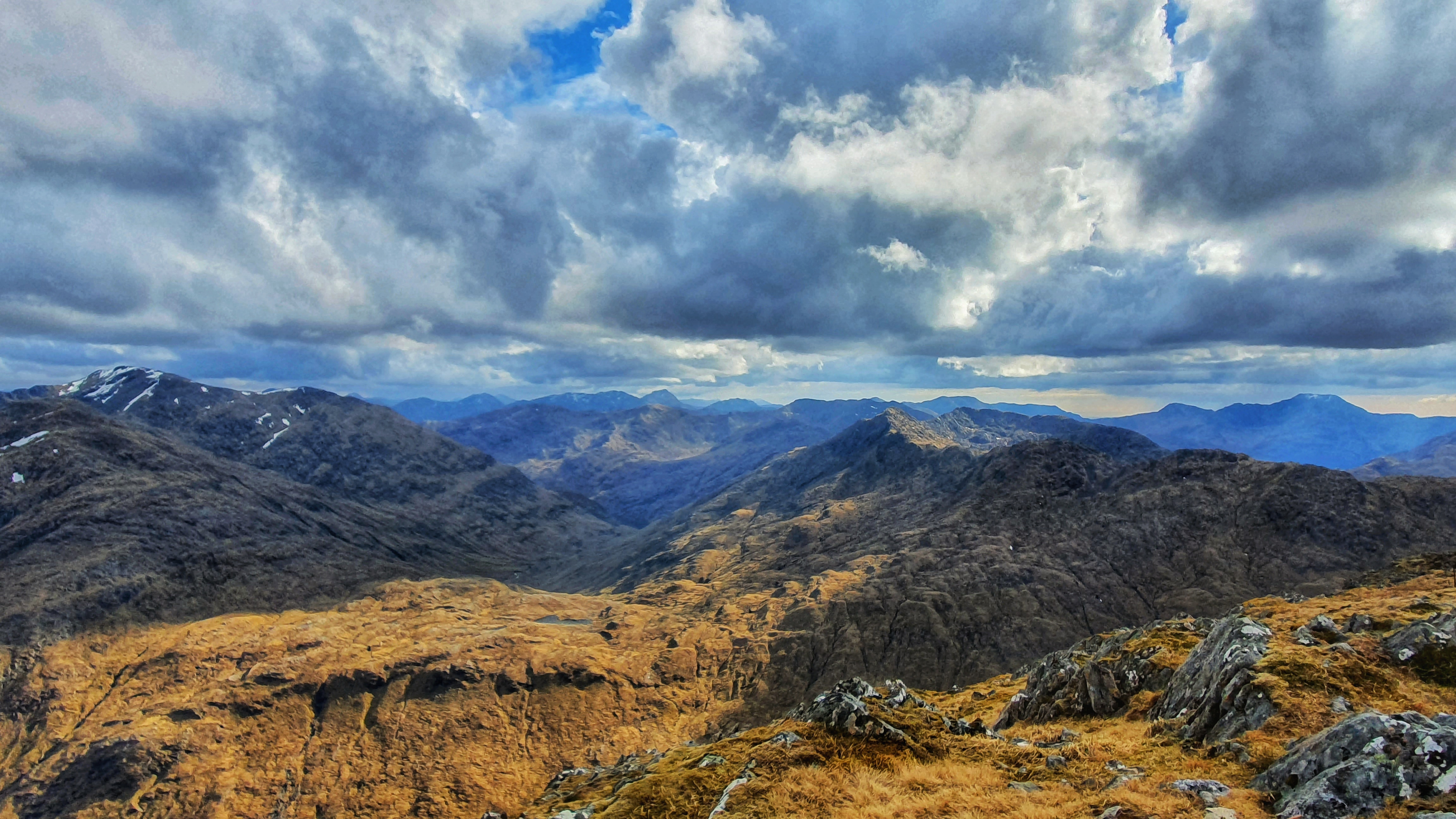 There was no point hanging around so we continued on to Munro No. 3. After walking a short distance and as if someone just flicked a switch the clouds lifted and we were surrounded by some beautiful scenery, we had mountains for miles and miles and lochs, lots of them.