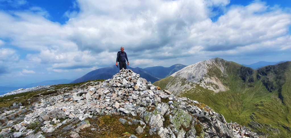 After a gradual descend we were soon on to a narrow bealach seperating the two Munro’s. Once at the bottom we made our ascent up a steeper, narrower zigzag path until eventually reaching the dome like summit.