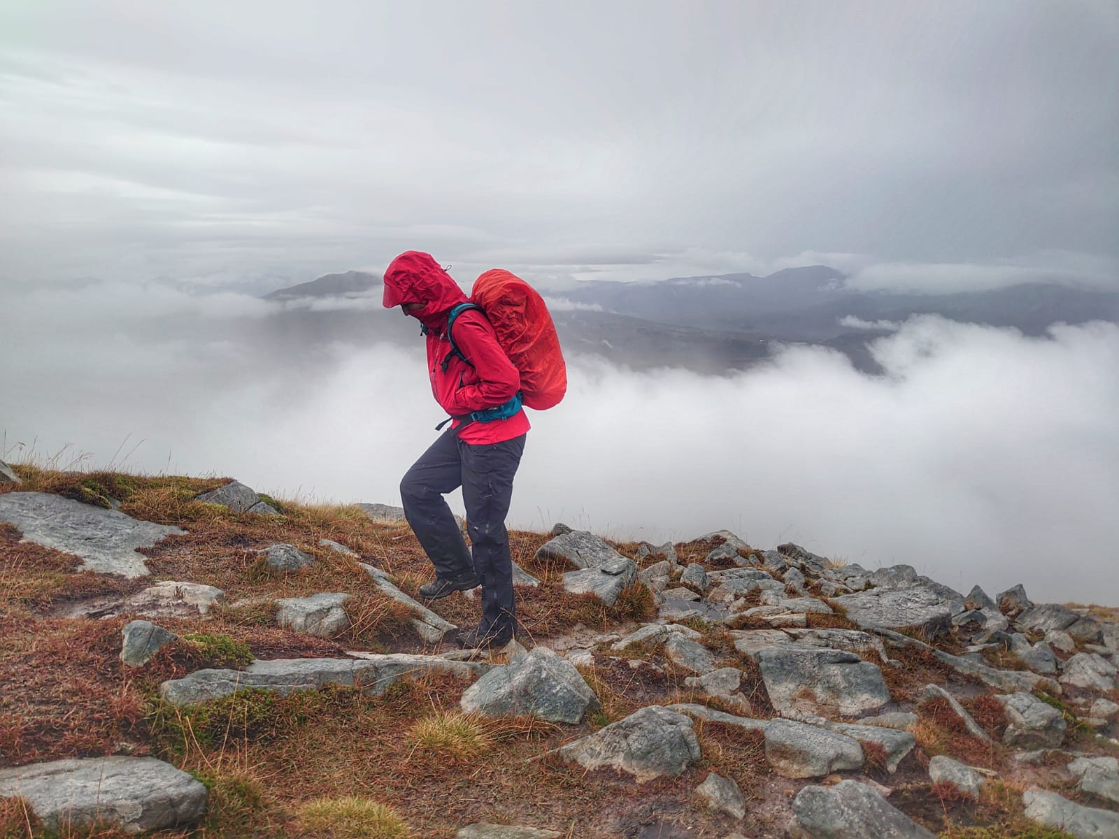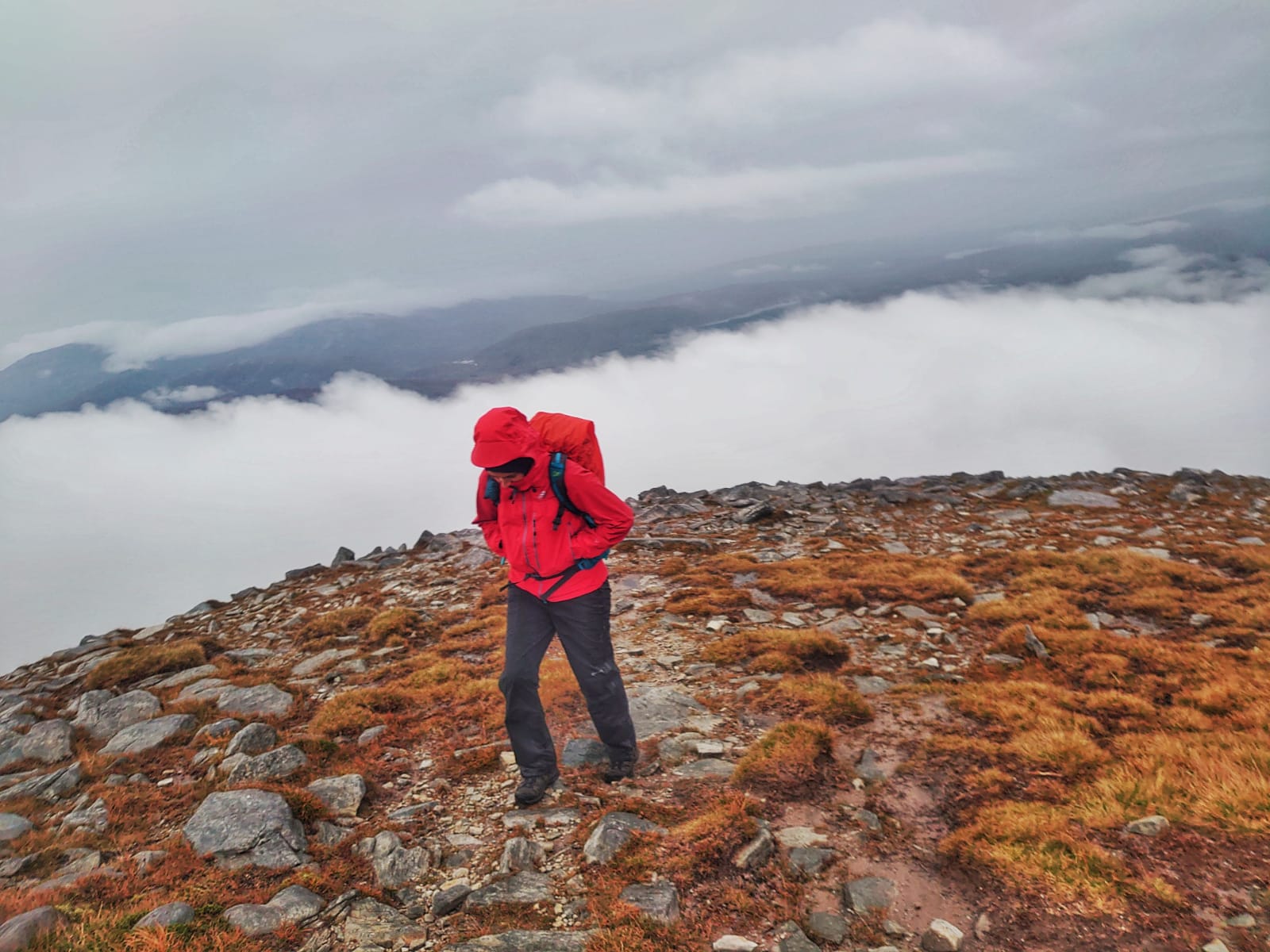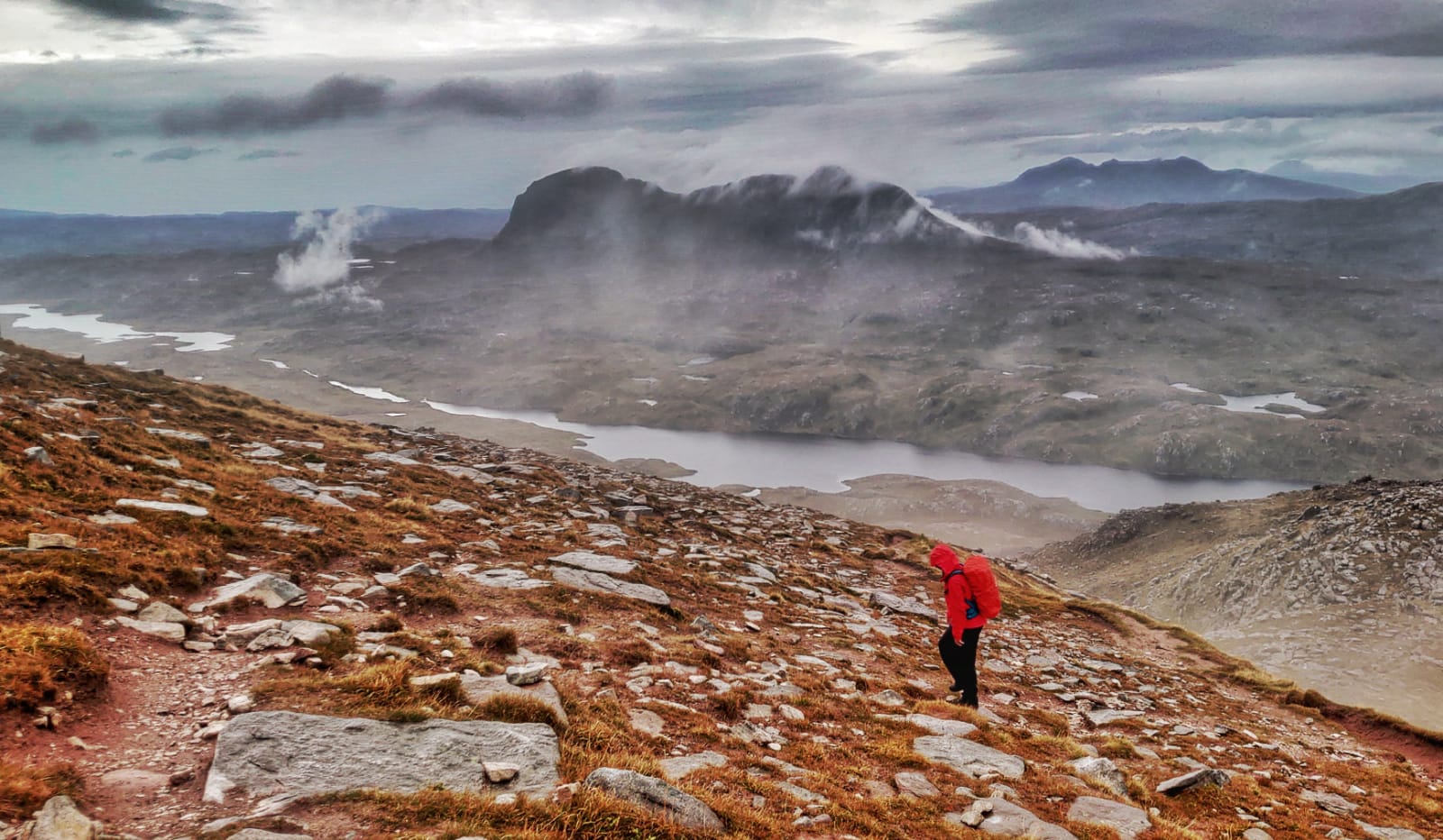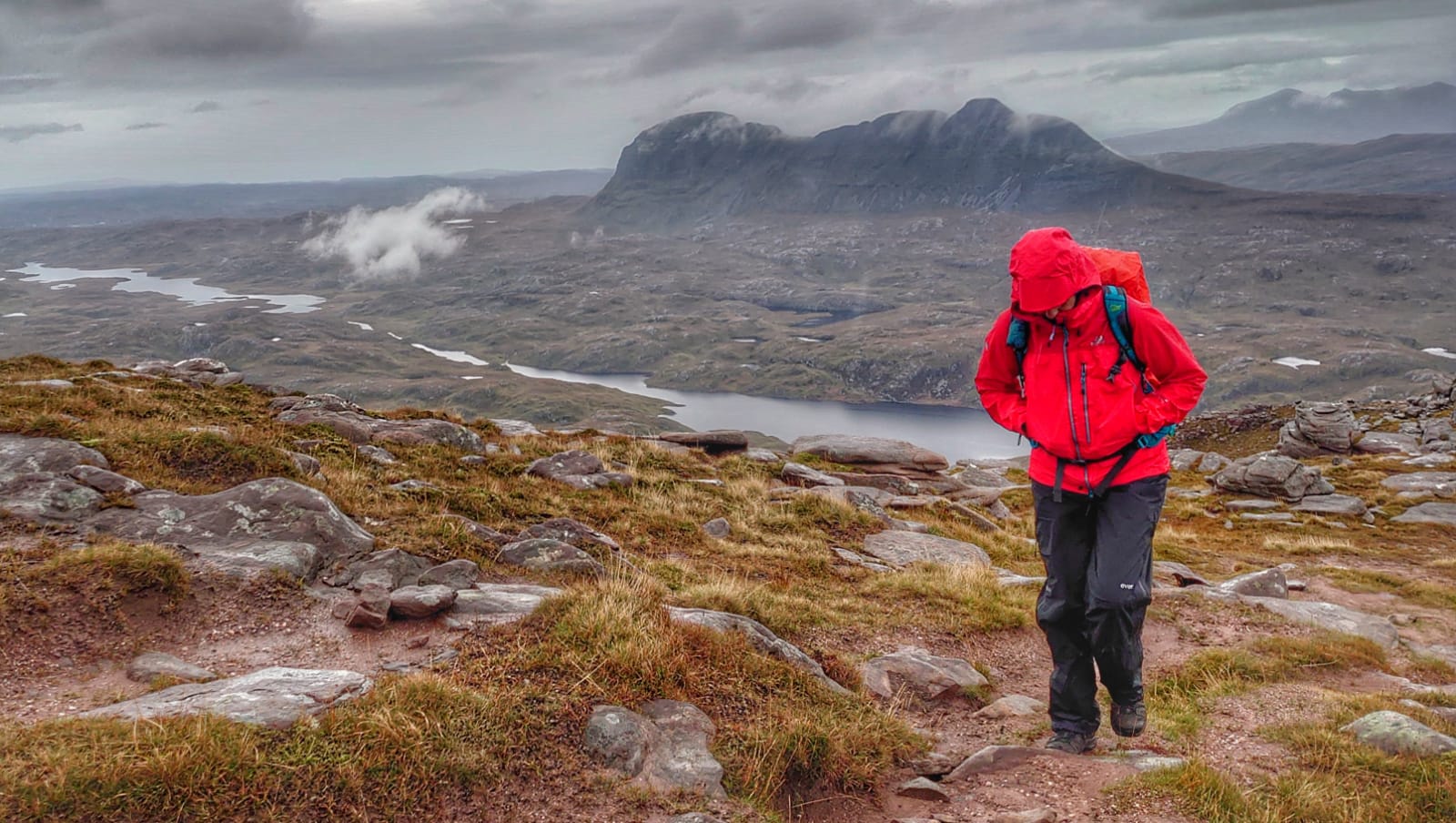 The summit of Cùl Mòr is marked by a cairn and a trig point with a stone circular wind shelter. On a fine day there would have been spectacular views out to the sea and across Assynt, today at the summit we were hit with wind and rain and some low lying clouds so the full view was not there but it was very atmospheric. Needless to say we didn’t hang around for long.