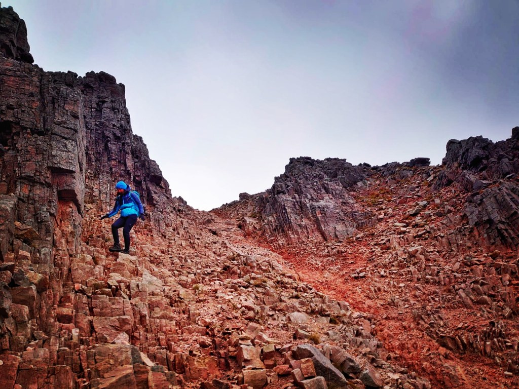 I tried not to think about the descent at this stage (but I did of course) as I carried on upwards along more rock where we could see the scree coned summit of Ruadh-stac Mor.