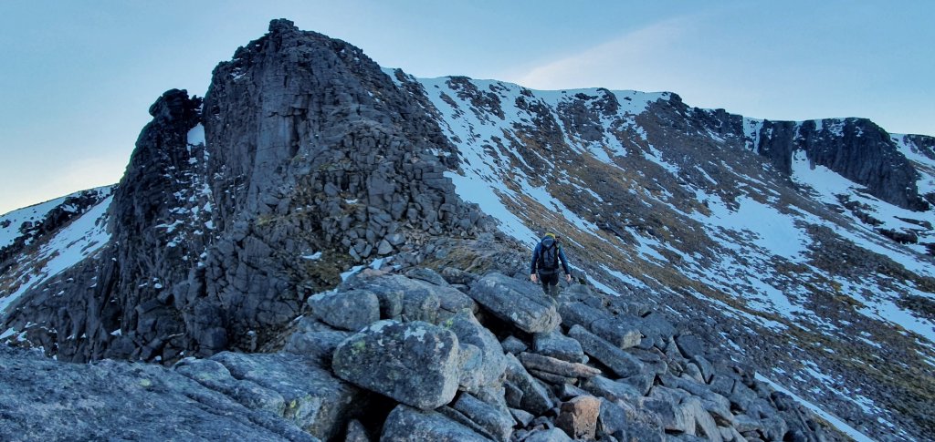 The ridge begins as some have described as a ‘broad whale-back’ covered with boulder fields, before narrowing to a spectacular, if a little short lived exposed scramble.