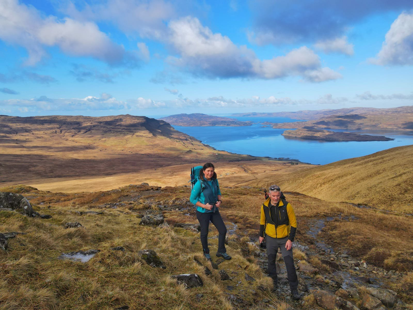 Today the weather was amazing, mostly clear blue skies with very little wind, so we were off to climb this one great, rocky mountain which dominates the landscape and one which will definitely offer some fantastic views of the many islands dotted around the Minches and further afield.