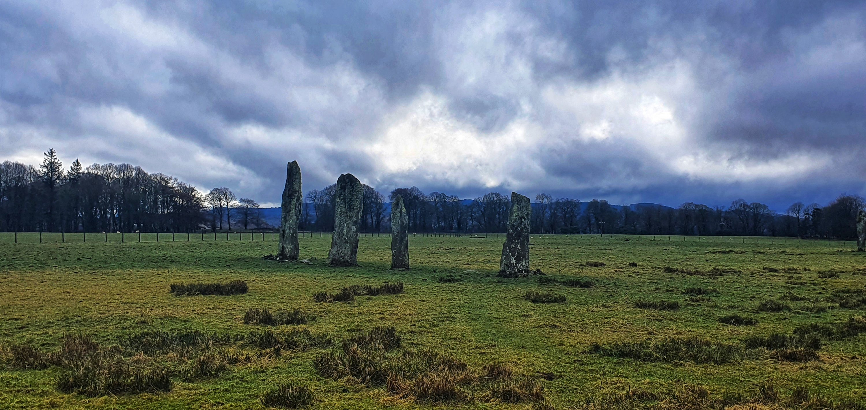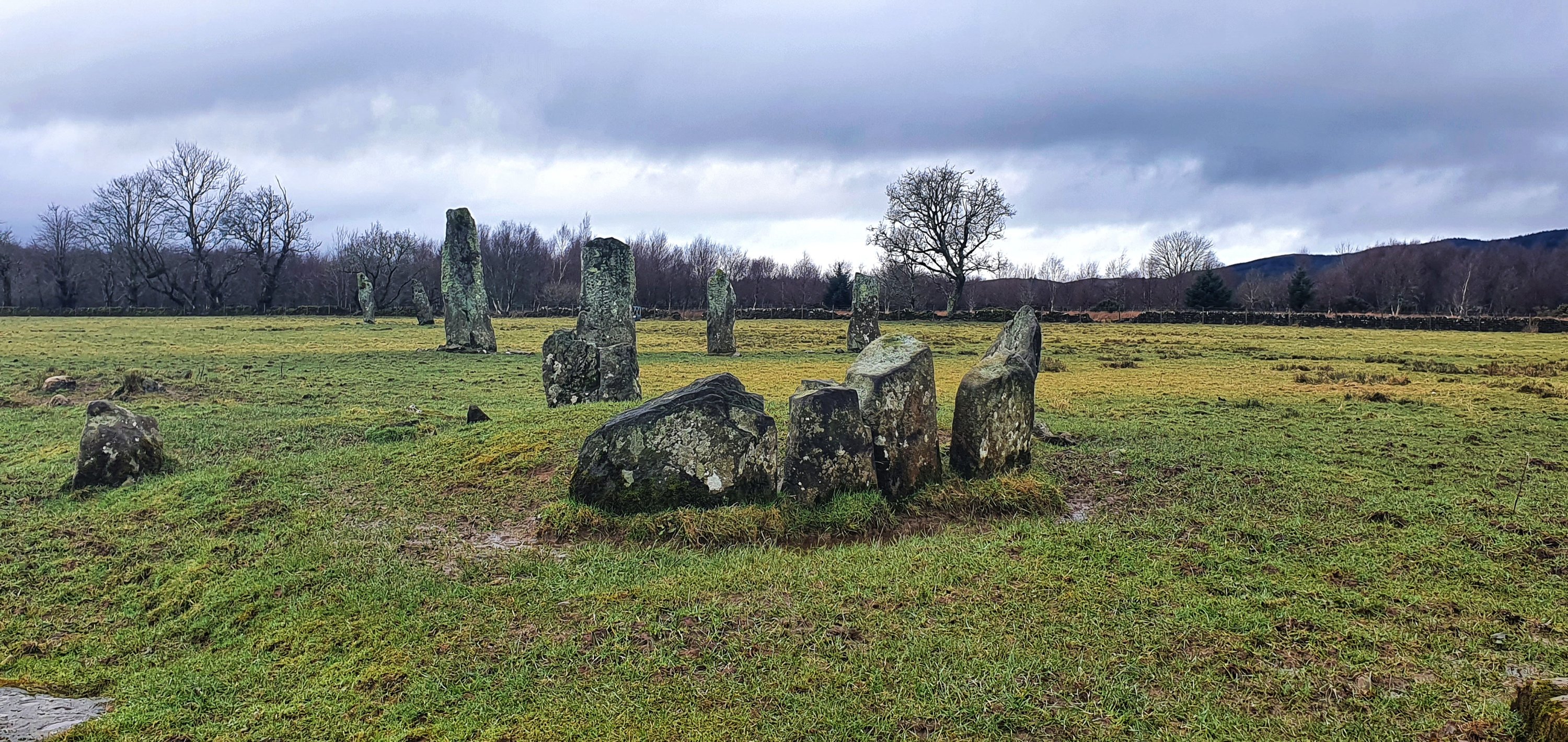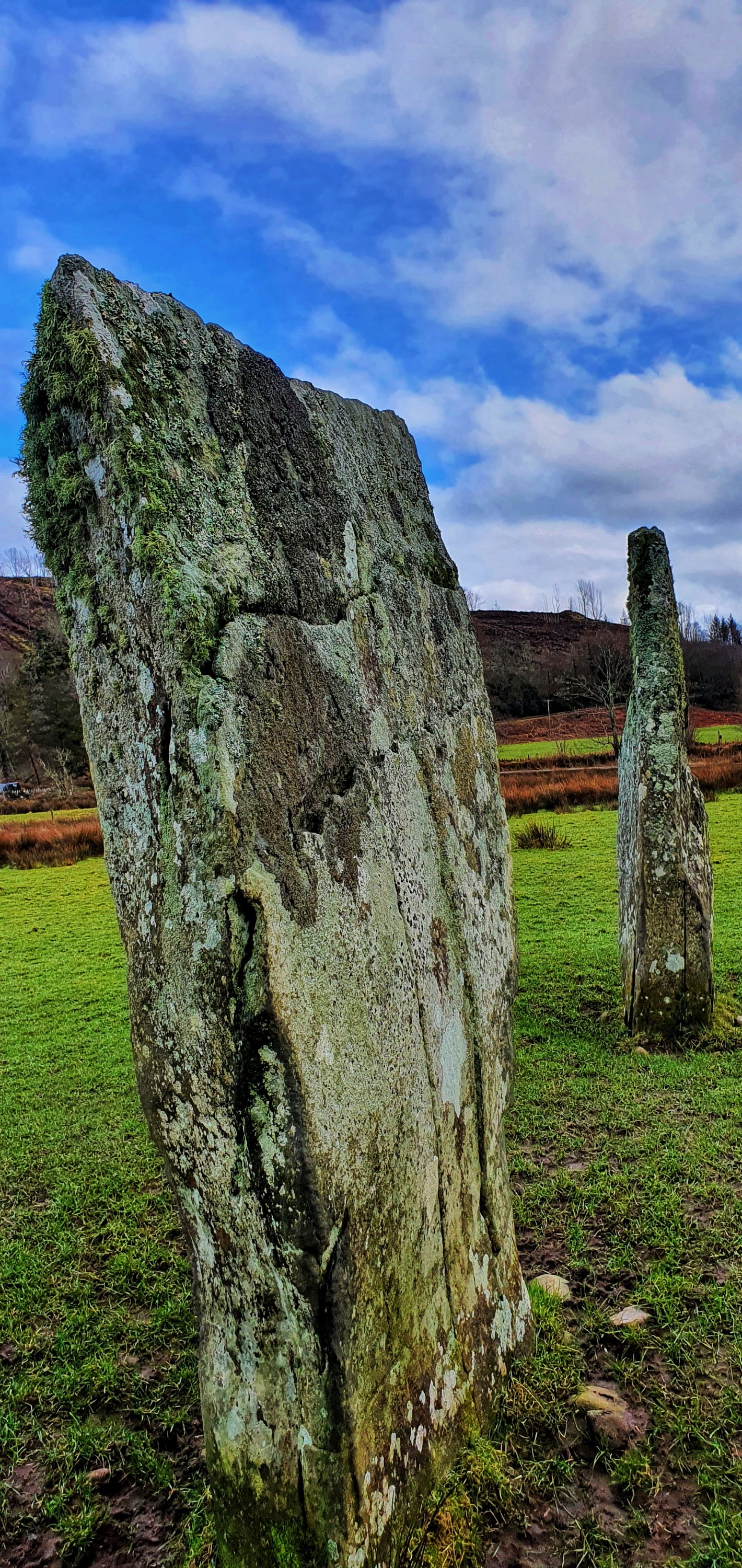 From here there was a wet and muddy grassy path out to the Baluachcraig cup and ring marks and over to the impressive Ballymeanoch standing stones.