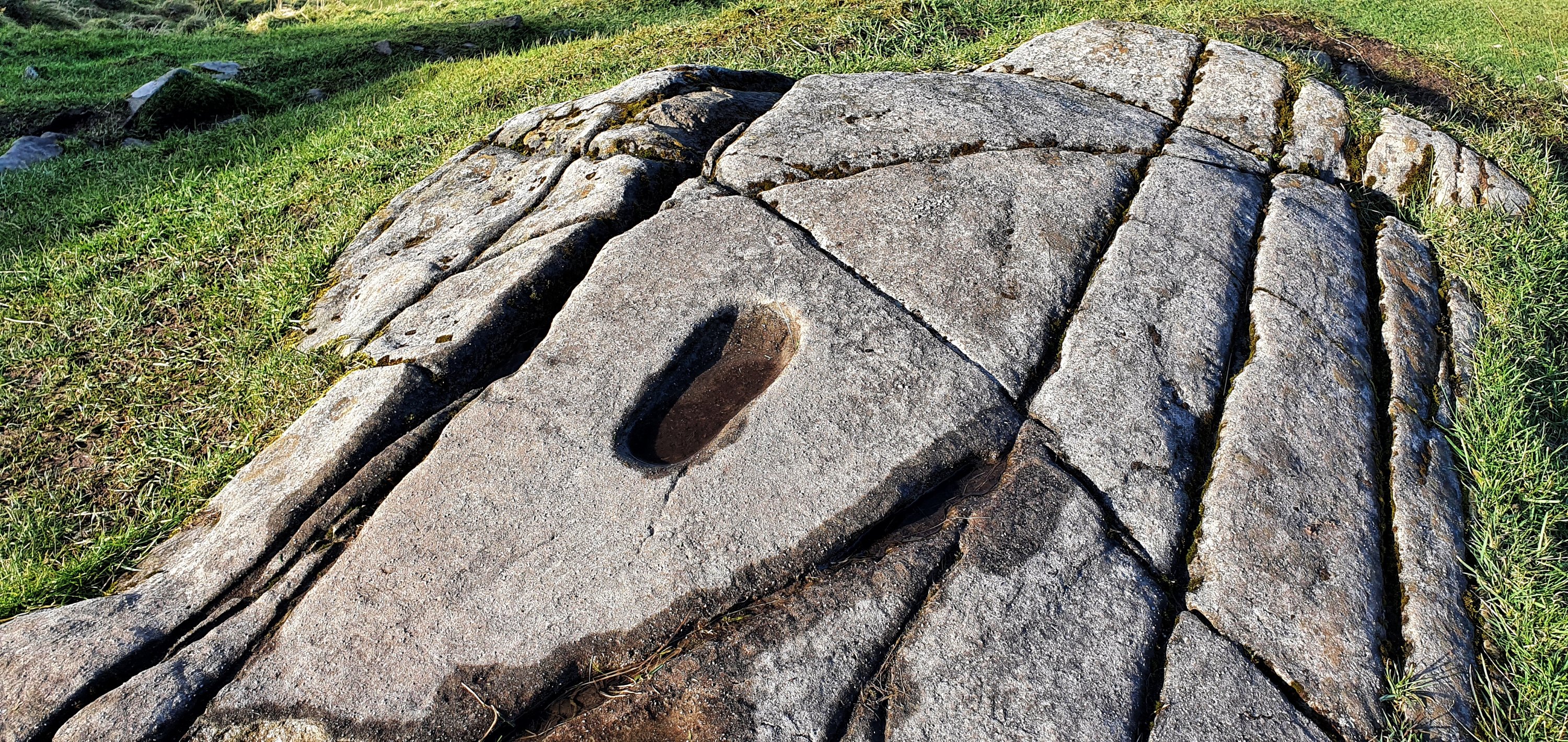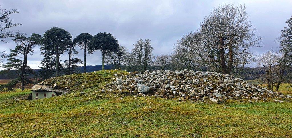Surrounded by trees, this large cairn was built in the early Bronze Age, about 4000 years ago. When it was excavated in 1864, three stone lined graves or cists were discovered. The most unusual of these cists is the one covered by a massive capstone. It contained the remains of up to ten people, along with a whetstone, a greenstone axe and a flint knife.
