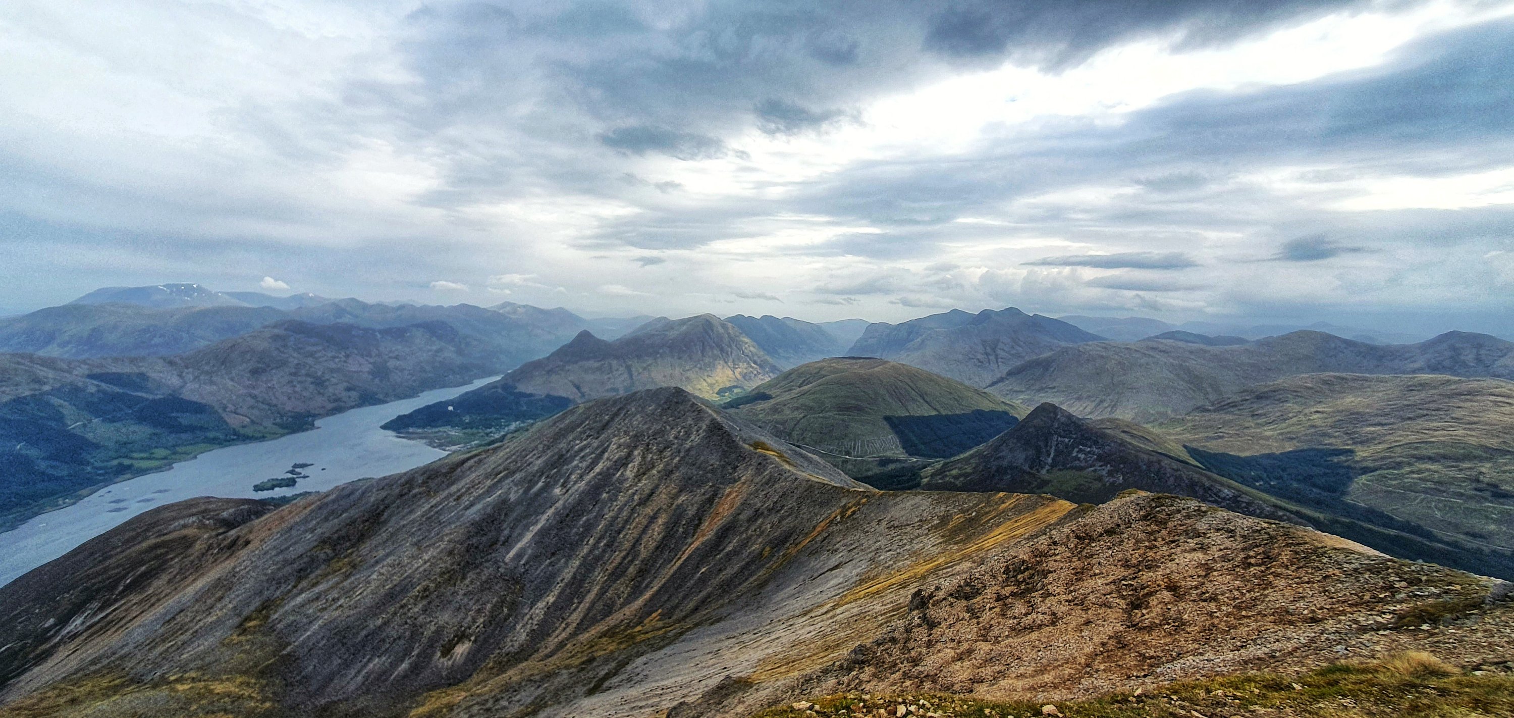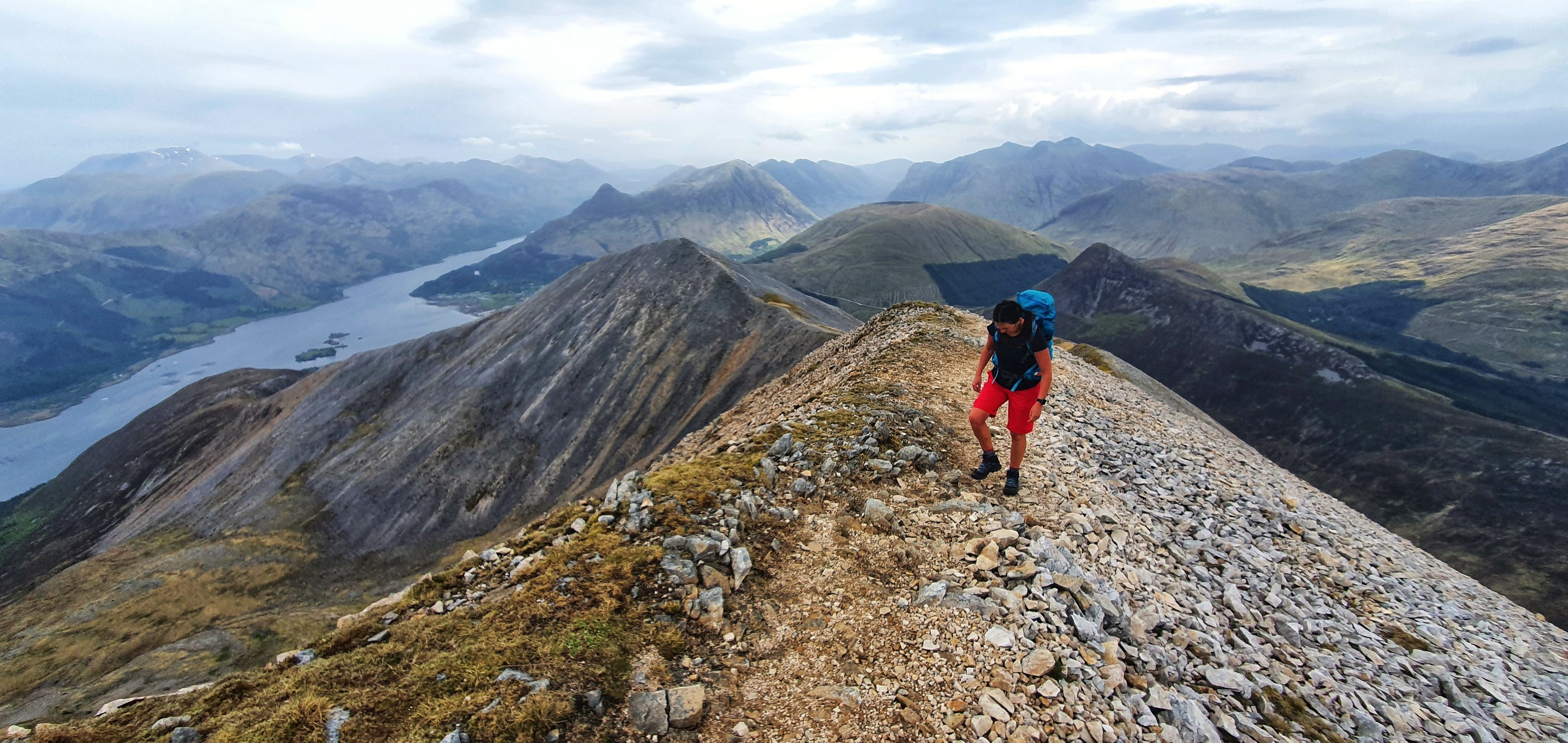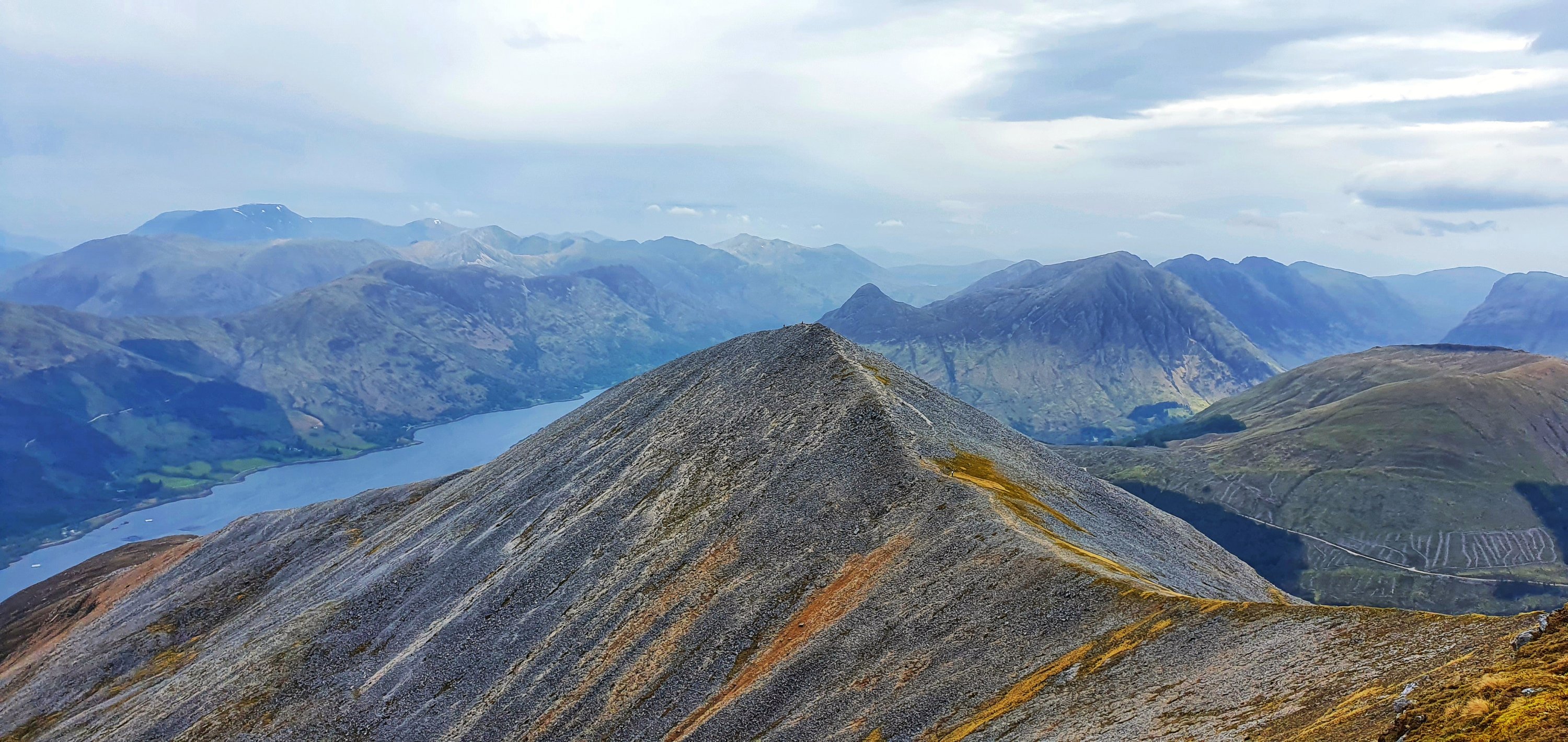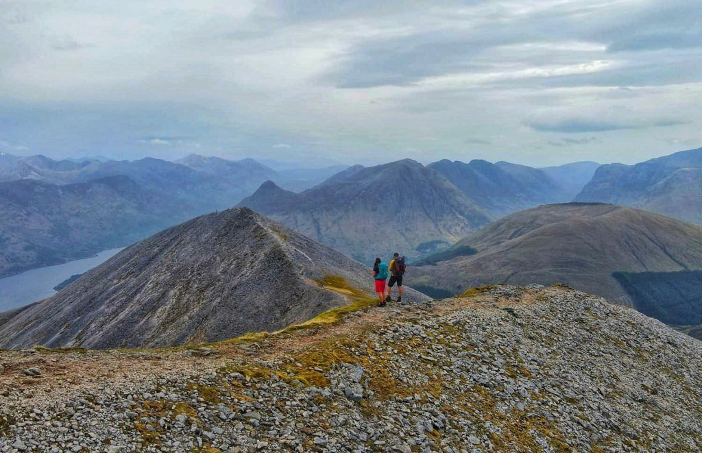 Just above this section the gradient eased with another rocky but less steep bit before we finally hit Sgòrr Bhan. A small cairn sits here but all eyes were on the viewpoint. Straight ahead we could see this amazing curving ridge towards Sgòrr Dhearg and behind that Sgorr Dhonuill. Looking back we could see all the way up Glencoe, what a sight!