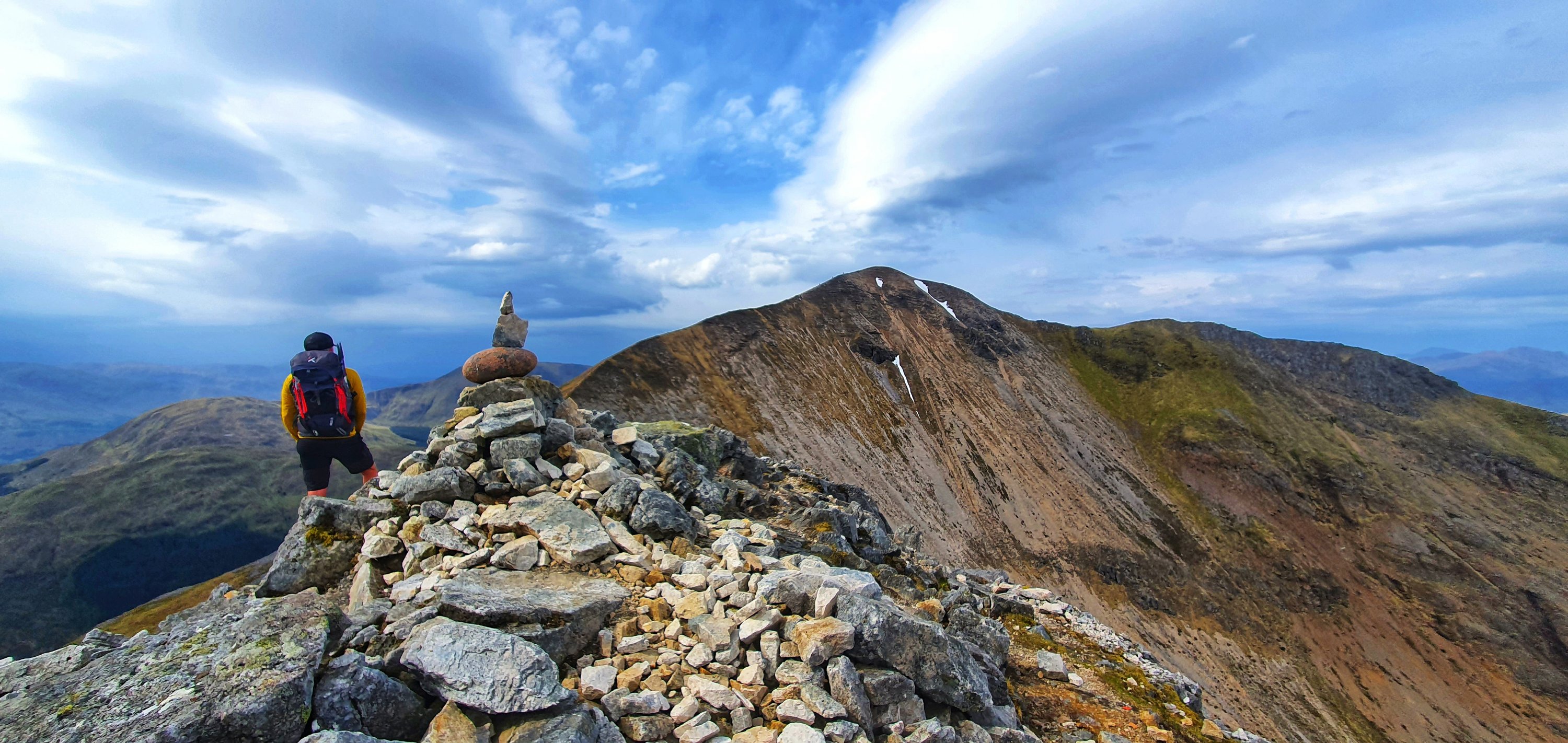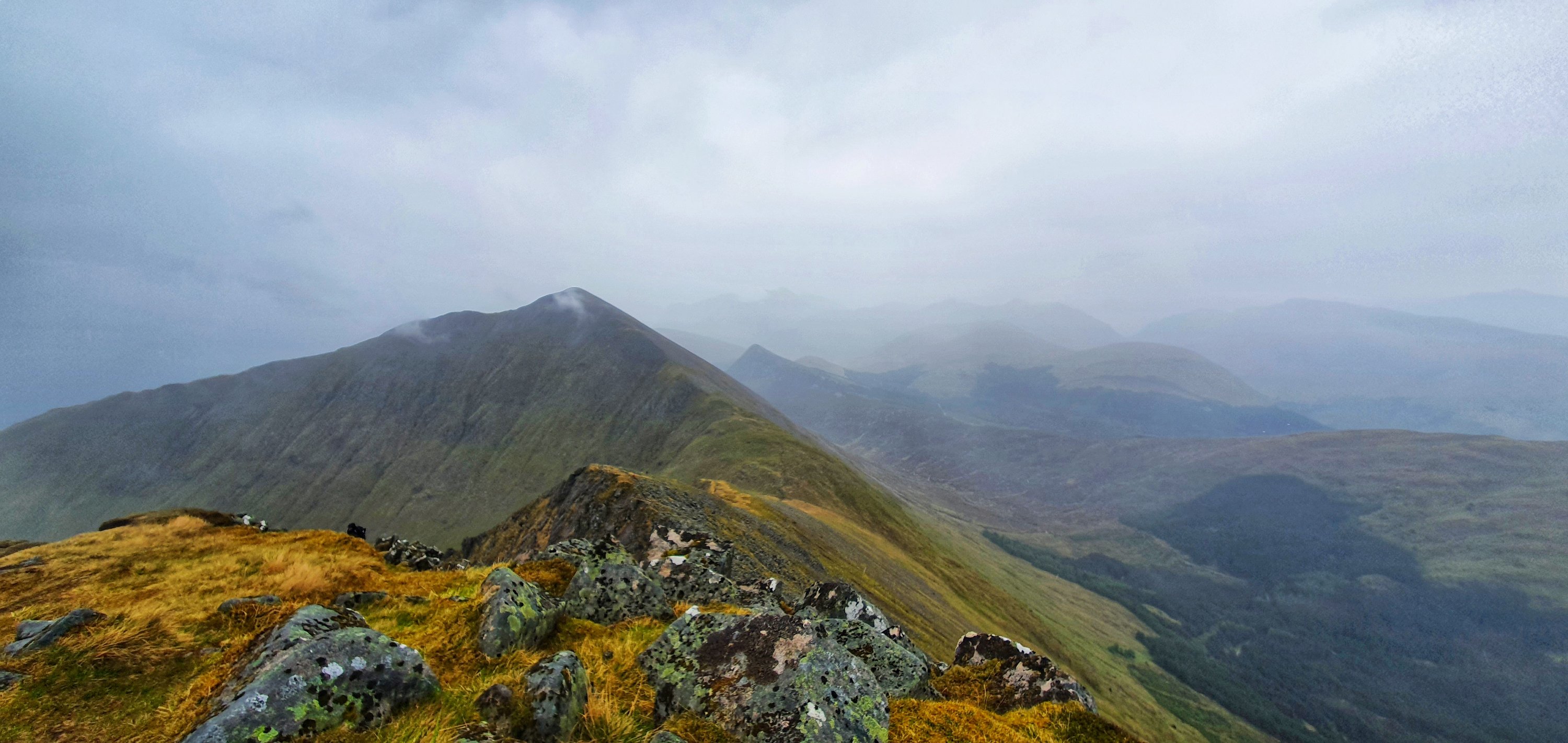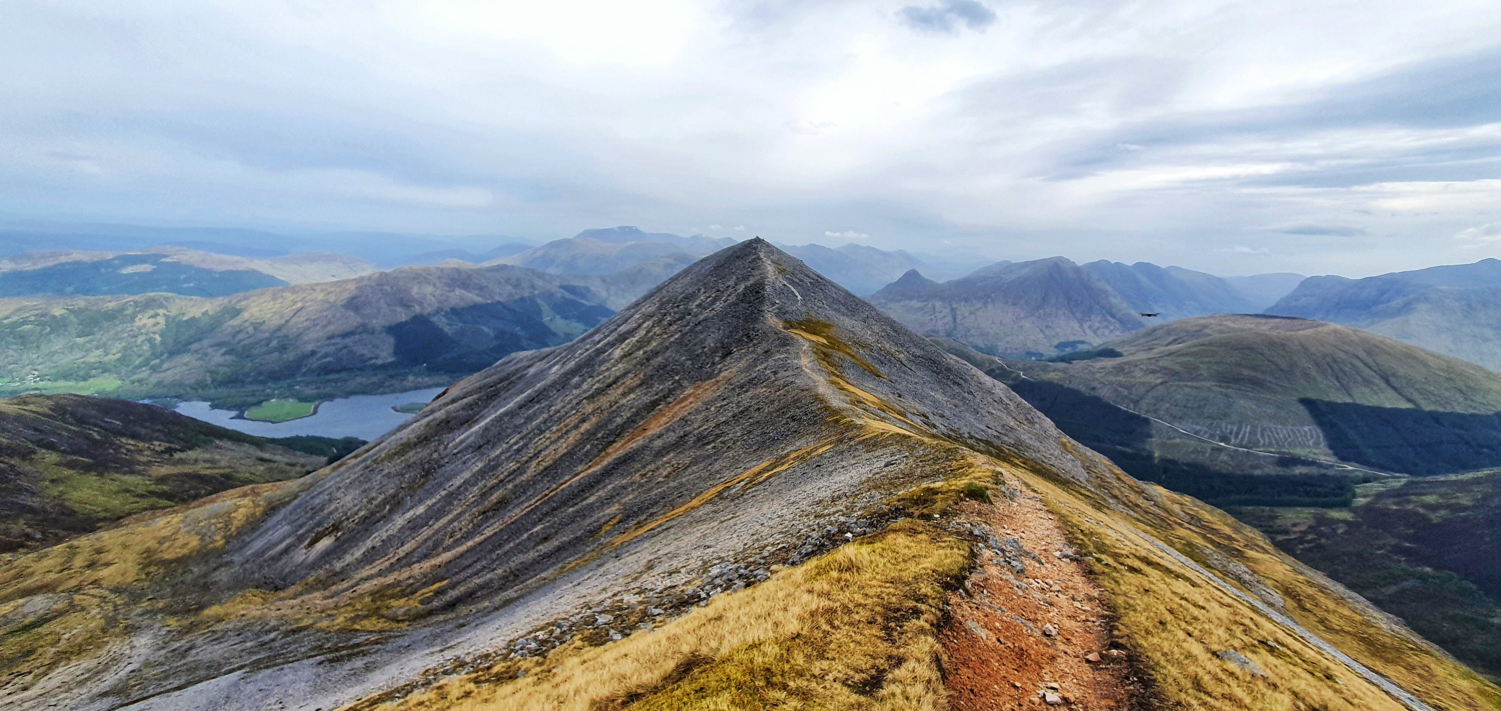 Just above this section the gradient eased with another rocky but less steep bit before we finally hit Sgòrr Bhan. A small cairn sits here but all eyes were on the viewpoint. Straight ahead we could see this amazing curving ridge towards Sgòrr Dhearg and behind that Sgorr Dhonuill. Looking back we could see all the way up Glencoe, what a sight!