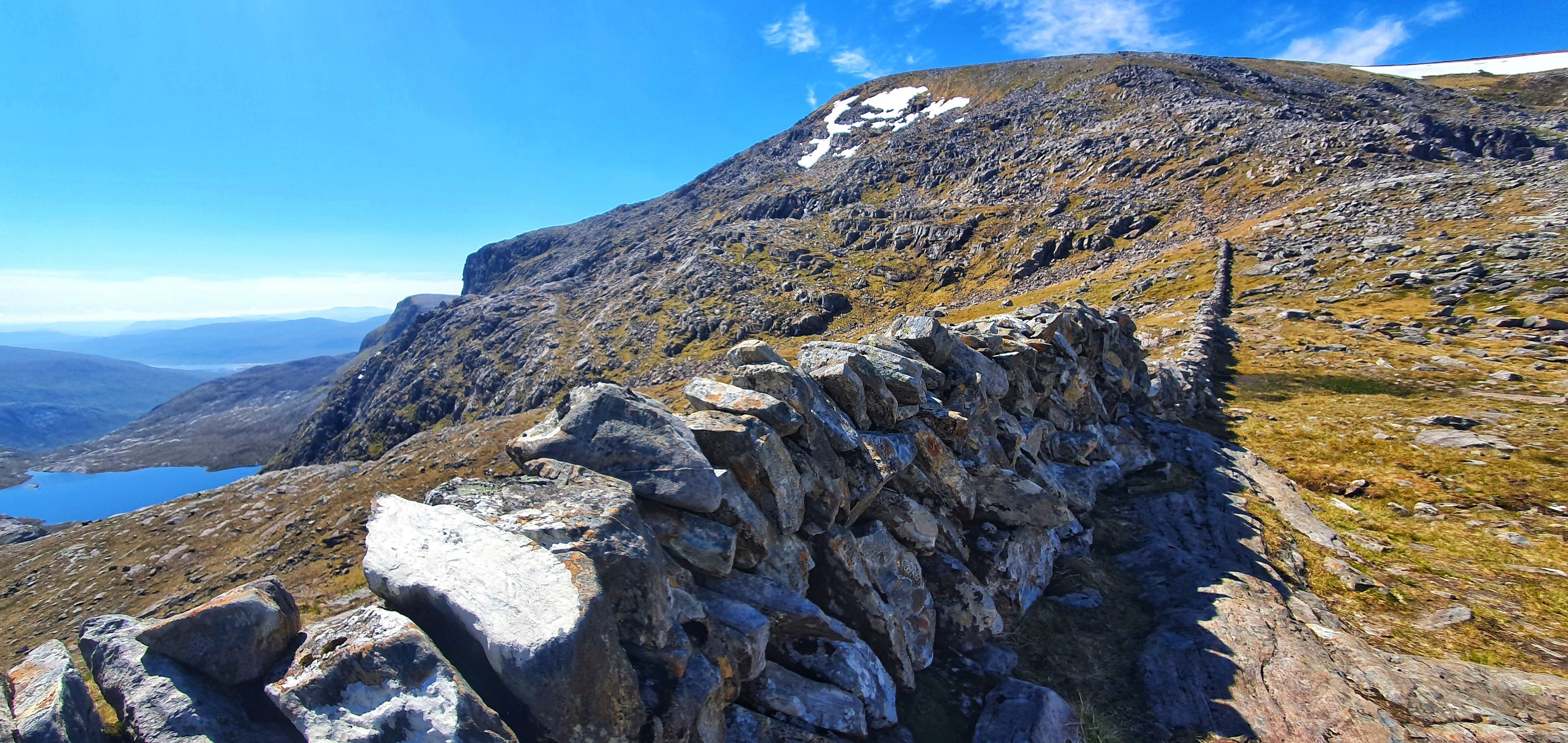 Whenever, wherever I walk in Scotlands mountains there are often reminders that you are walking through history, some sad and painful, whether it be the remains of solitary houses standing remotely in glens where everyday must have been a struggle way beyond you can comprehend or this wall climbing steeply up this remote and wild mountain.