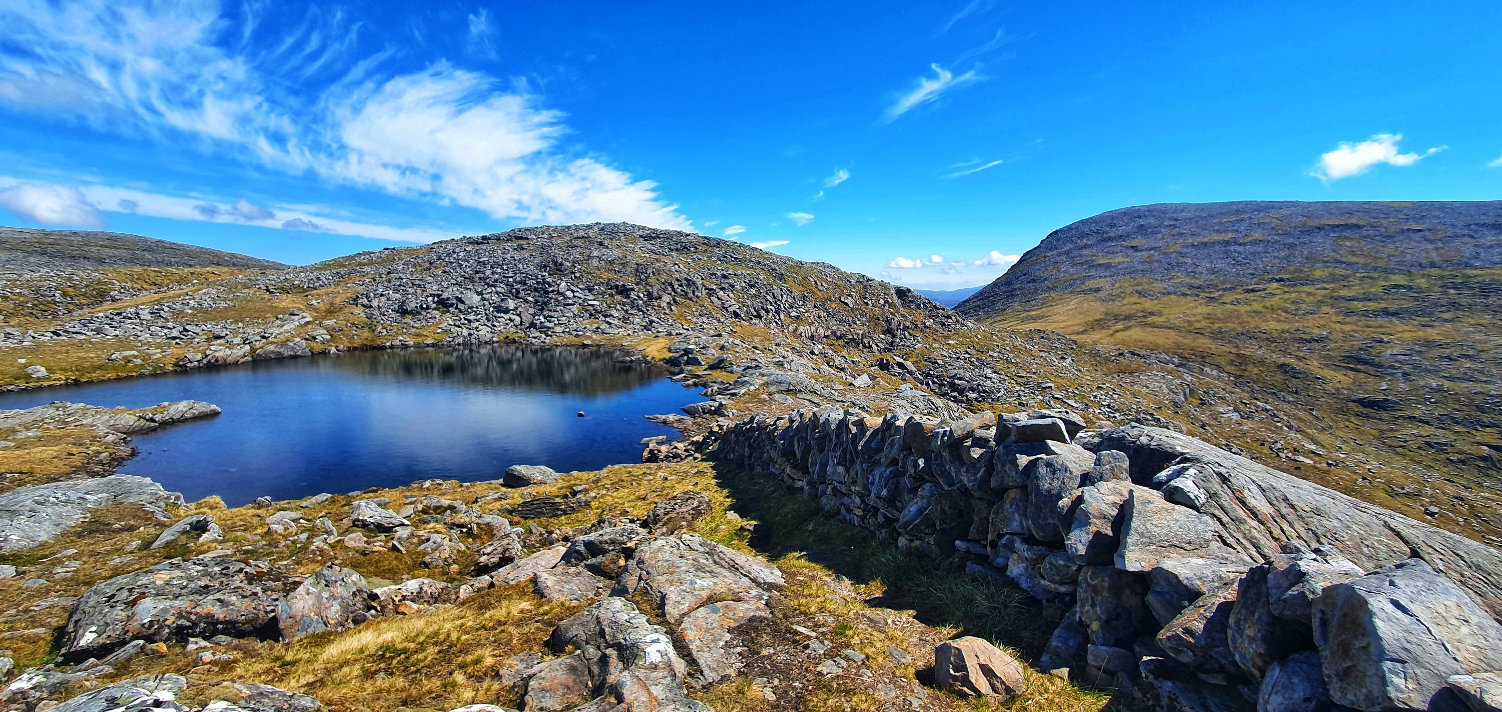 Our first Munro was going to be Beinn Dearg. This Munro was steep and very rocky and had one massive stone wall running all the way up. Soon we were climbing very steeply beside the wall and up over some bouldery ground and views back over the bealach were beautiful.