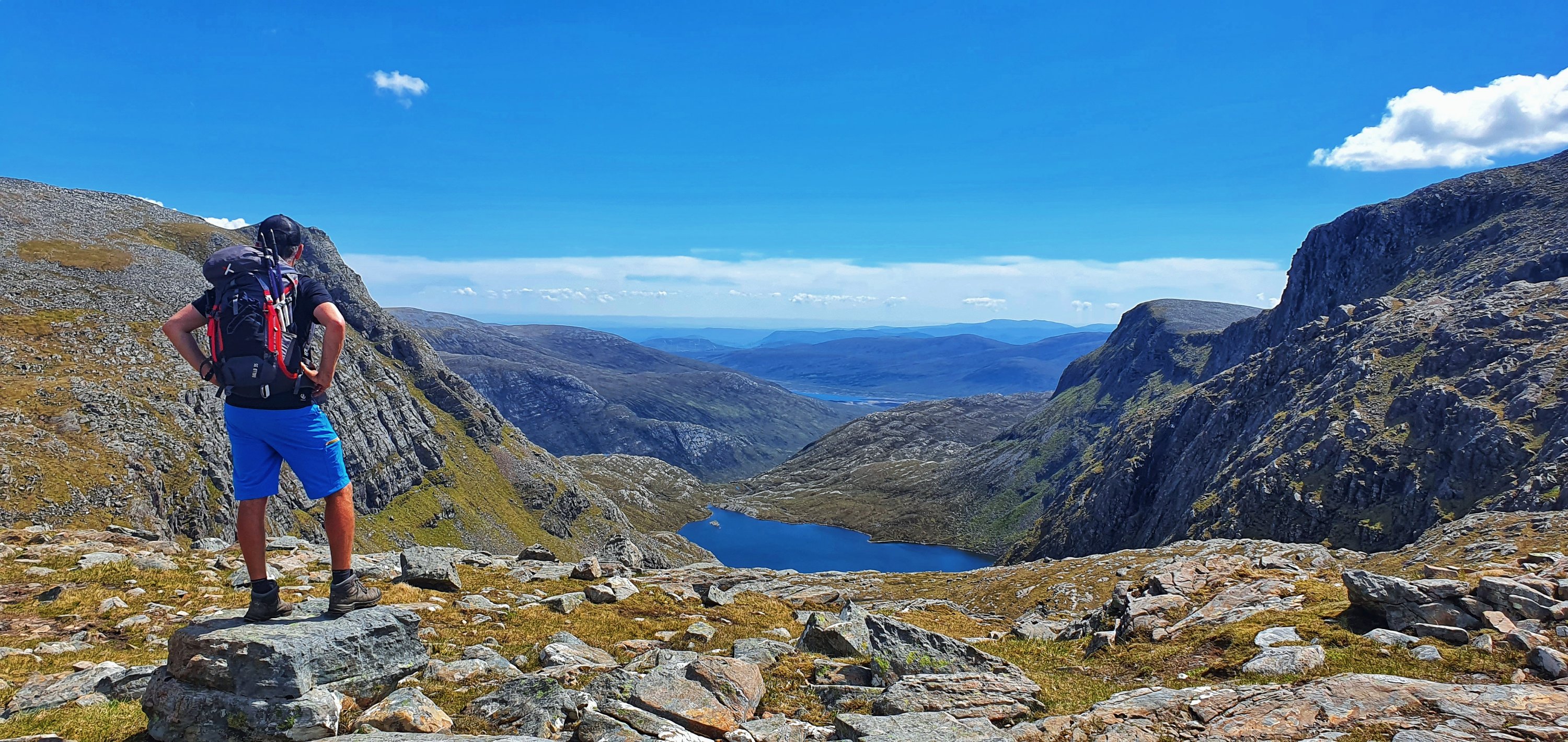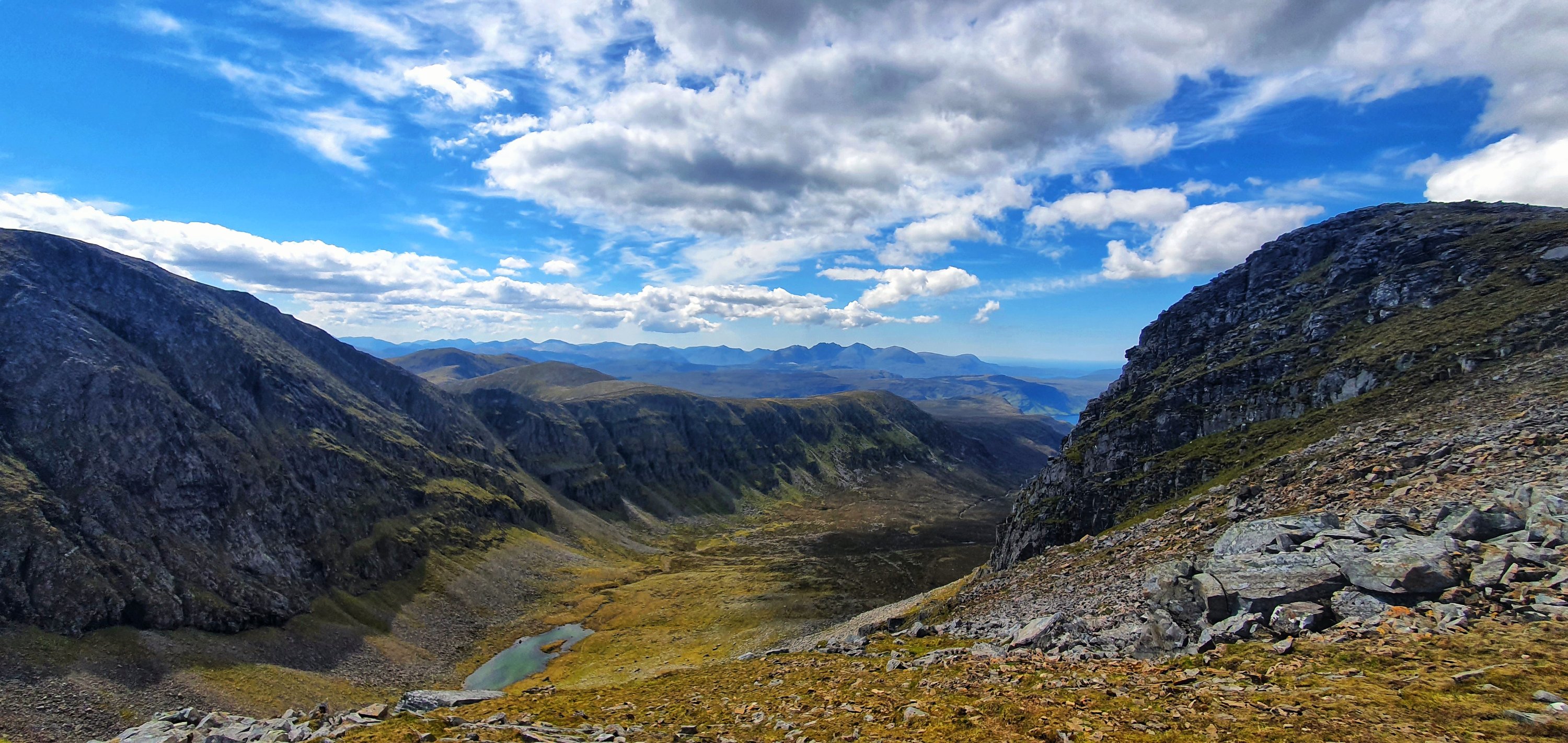The ascent of Cona Mheall is on a grassy and scree open slope with a final boulder-field summit which I never really mind as I hop to and from boulders. We finally reached the small cairn and were rewarded with some awesome views across the Coire to the cliffs of Beinn Dearg. After having a bite to eat we retraced our steps back down to the first bealach and then back to Lochan Uaine.
