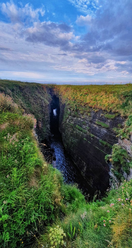The walk began at The Gloup, a dramatic collapsed sea-cave separated from the sea by a land bridge about 80 yards wide. It drops down around 80 feet, with the sea crashing in through the blow hole. The name comes from the Old Norse “gluppa” – a chasm.