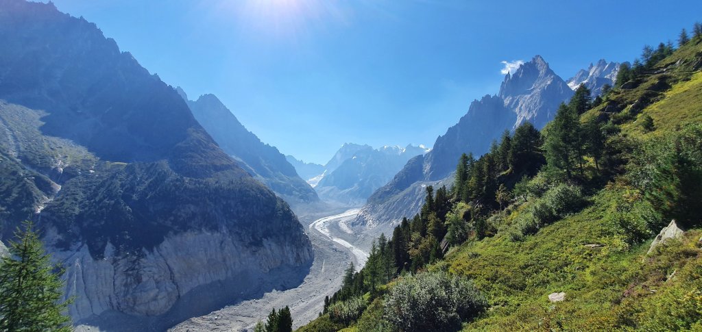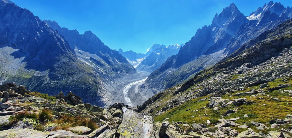 The high traverse along the Grand Balcon Nord features nonstop, panoramic views of Mont Blanc, the Chamonix Aiguilles, the Aiguille Rouges, Le Brevent and the Chamonix Valley. The hike starts at Montenvers with stunning views of the high peaks towering above the Mer Glacier.