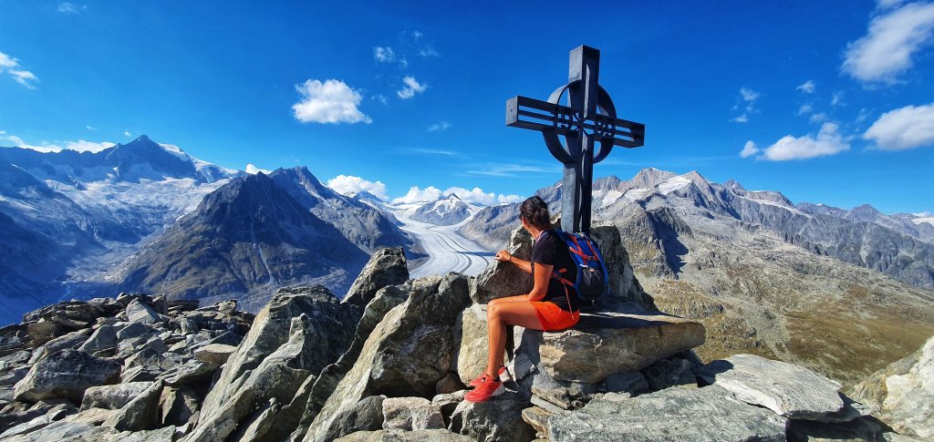 This path would be described as an alpine route, but it was nothing too difficult, a few steep sections, a few rocky sections and once we reached the peak, with its big metal cross, we were rewarded with magnificent views both of the Rhone Valley and the 4000m-peaks of Valais, including Jungfrau, Eiger and Monch and we could even see the Matterhorn from here and of course more stunning views of the Great Aletsch Glacier.