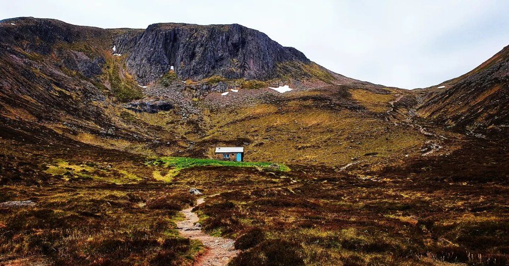 Next day we were up and away relatively early making our way towards Beinn a’Chaorainn. Last night had been so cold in the tent we had hardly slept a wink. I woke up stiff, possibly frozen! We straight away descended downwards (part of me wished it was an upwards to get some heat in the body) towards the Hutchison Memorial Hut. This bothy is in one of the most dramatic positions of any bothy, at the foot of the track up to Loch Etchachan and with the crags of Creagan a Choire Etchachan as a backdrop.