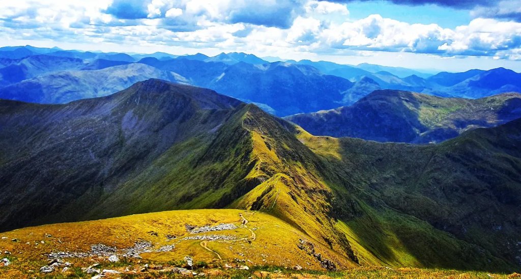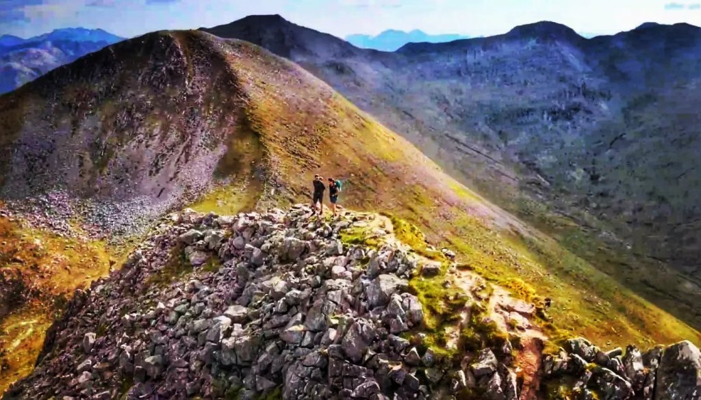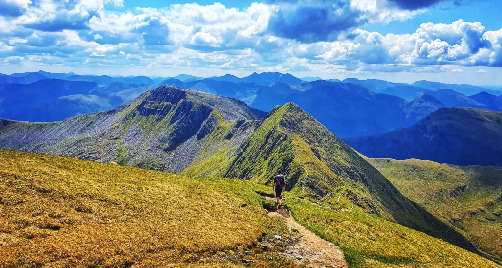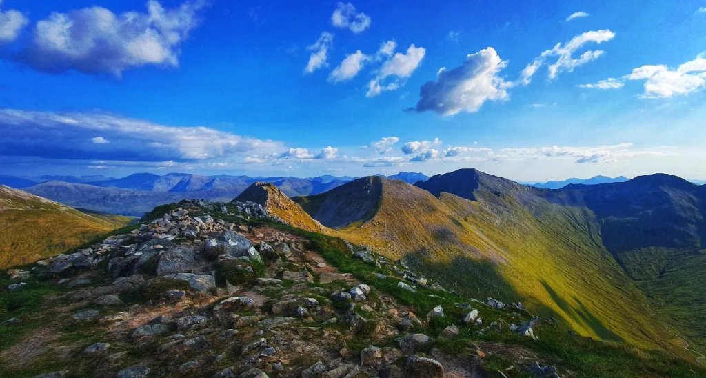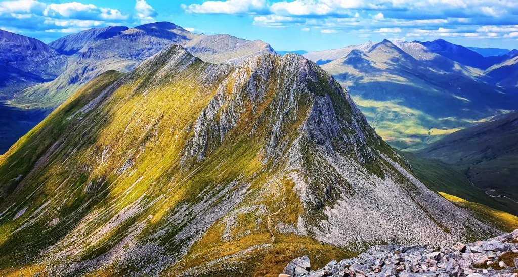 The route takes in An Gearanach, Stob Choire a Chàirn, Am Bodach and then follows the Devils Ridge which involves some scrambling along a narrow, rocky Ridge taking us to Sgùrr a’Mhaim.