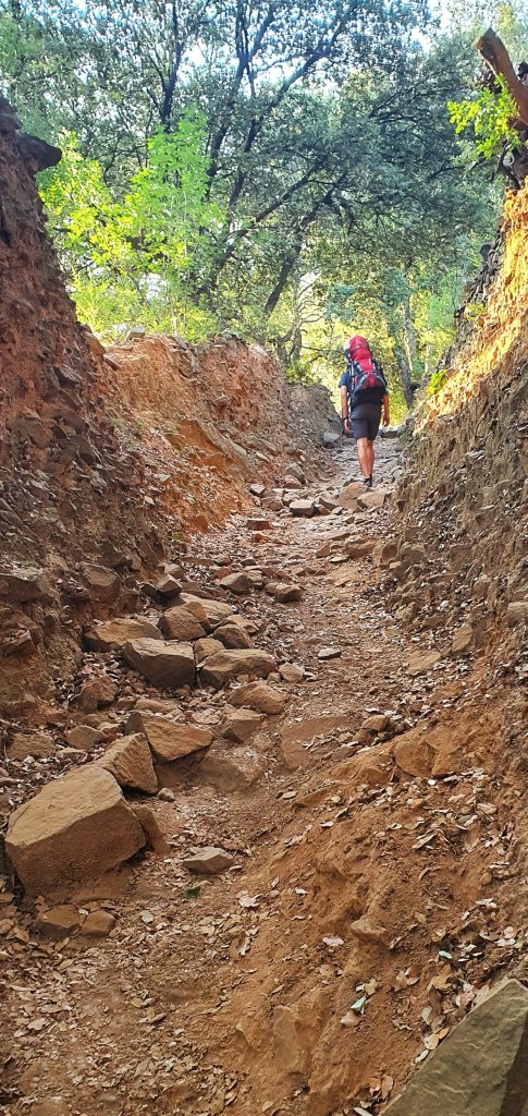 The trail is relentless, there is no leeway. On the first really steep slog up we caught up with a guy in front. On saying “bonjour” we realised the guy was Irish. We spoke briefly with him. He was struggling with the heat, the steep relentless upward climb, the weight of his bag, just everything really. Empathising with him we said we felt it also but slowly slowly wins the race, we had all day, there was no rush. We said our goodbyes for now as we would see him again in camp. We left him sitting trying to catch whatever shade he could.