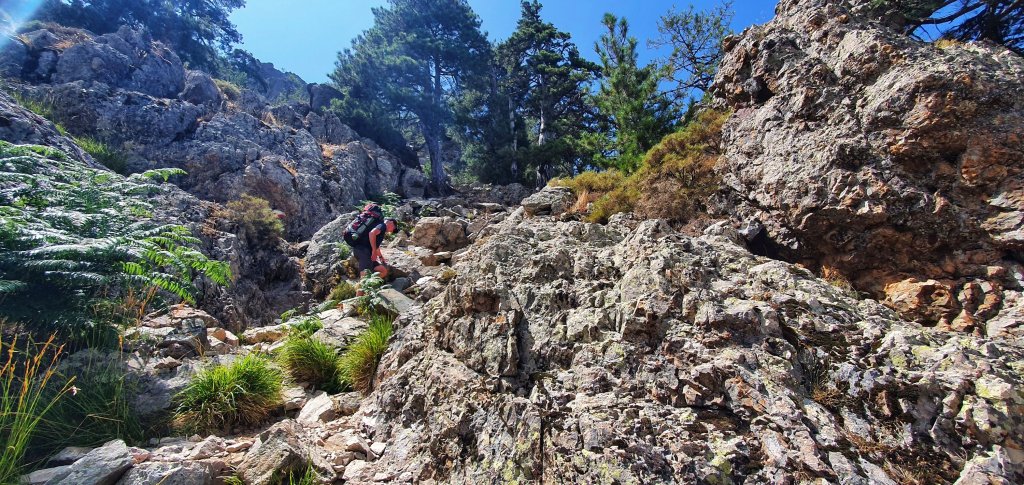 We gain altitude along a donkey path lined by a wall of purple, pink and yellow flowers and my goodness they smell amazing. Crossing several dry streams the path leads us through a pine forest offering a welcome shade as the sun feels hot.