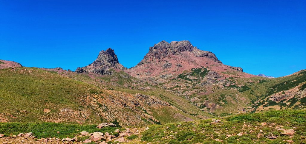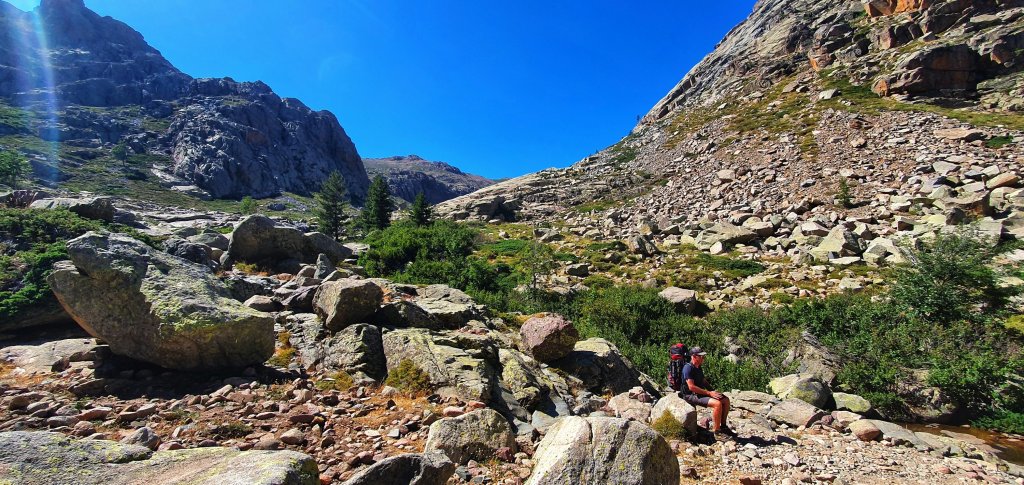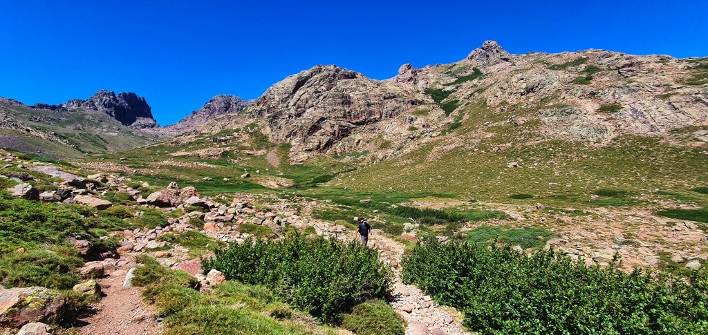 The descent through the valley of the Golo is steep, stony and rocky in places. We zigzag down the slopes covered in loose stones and scree.