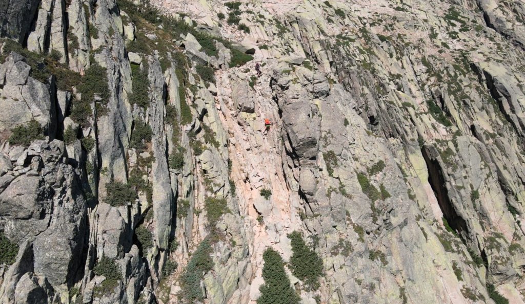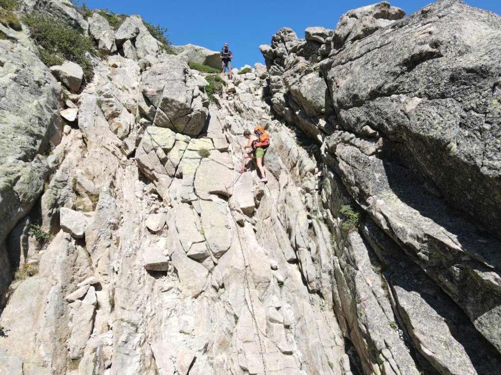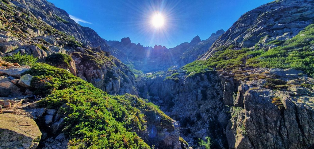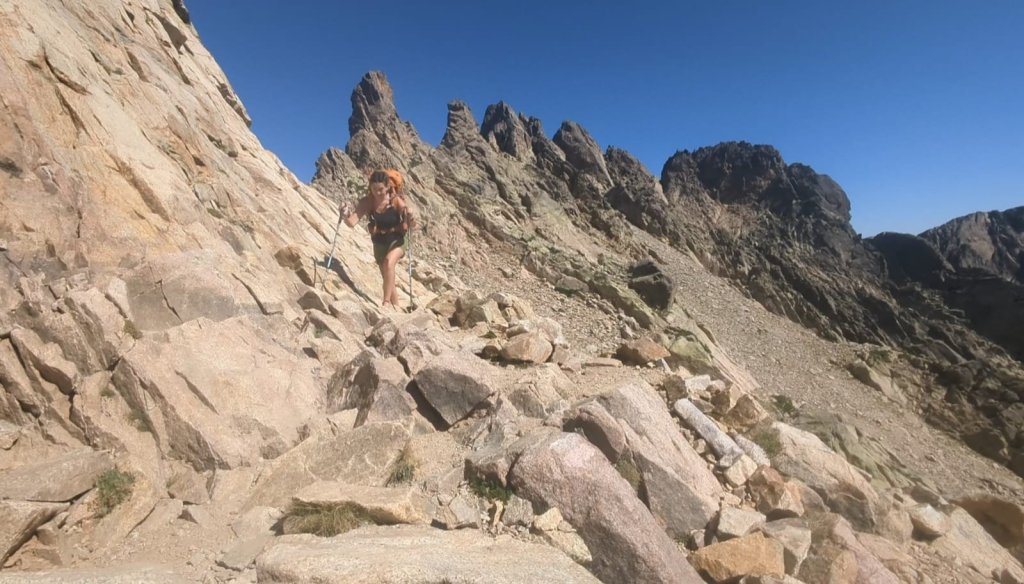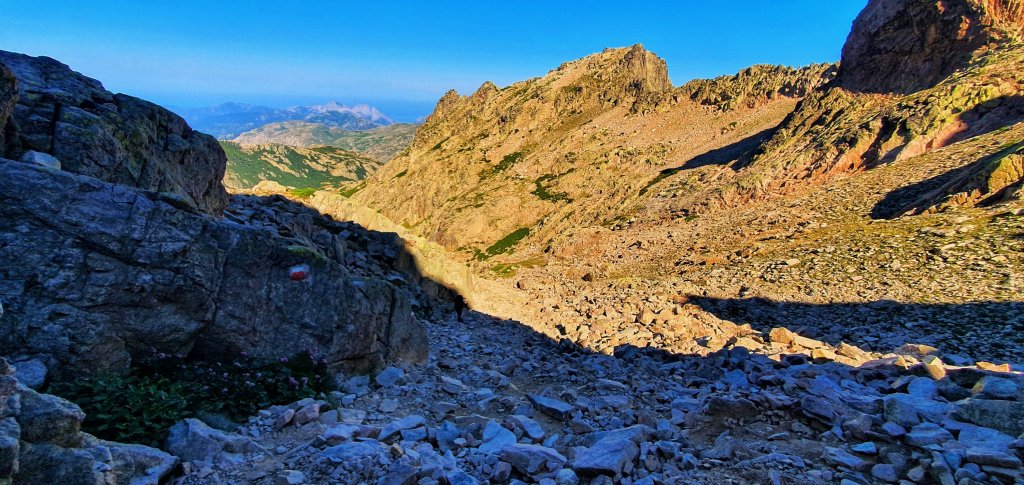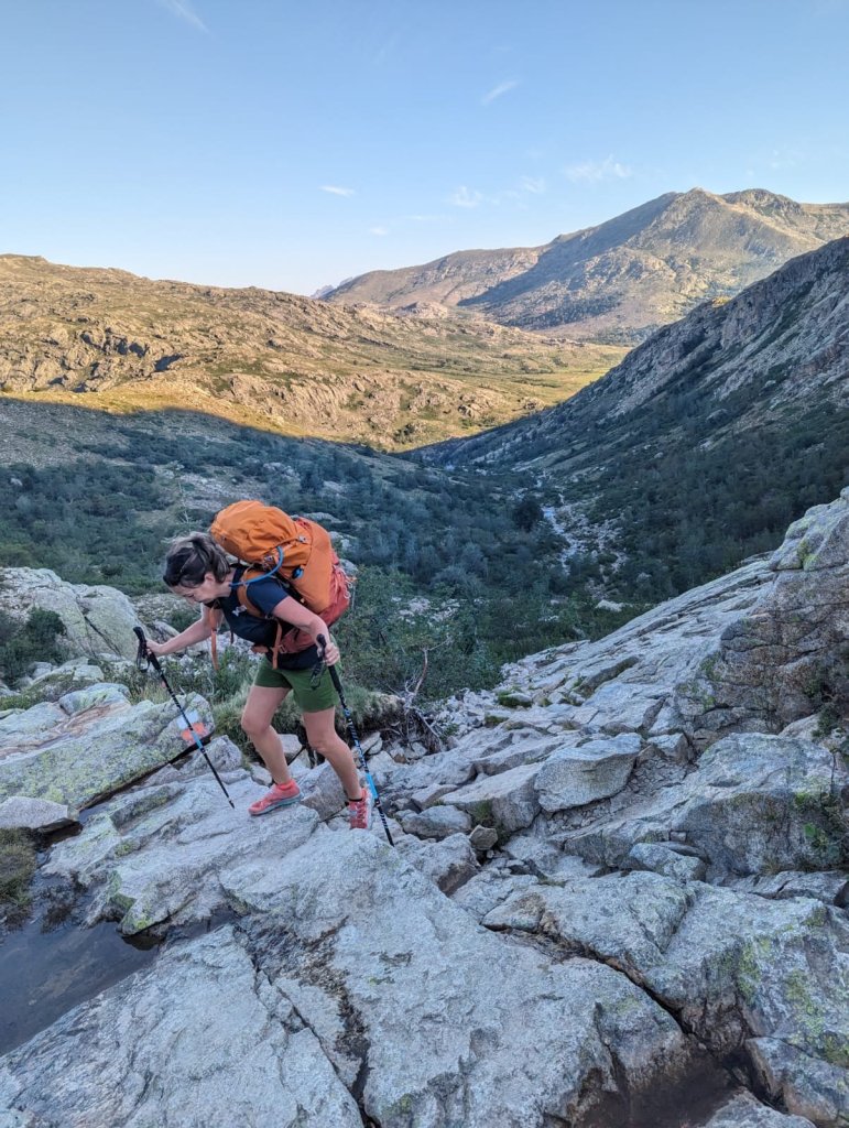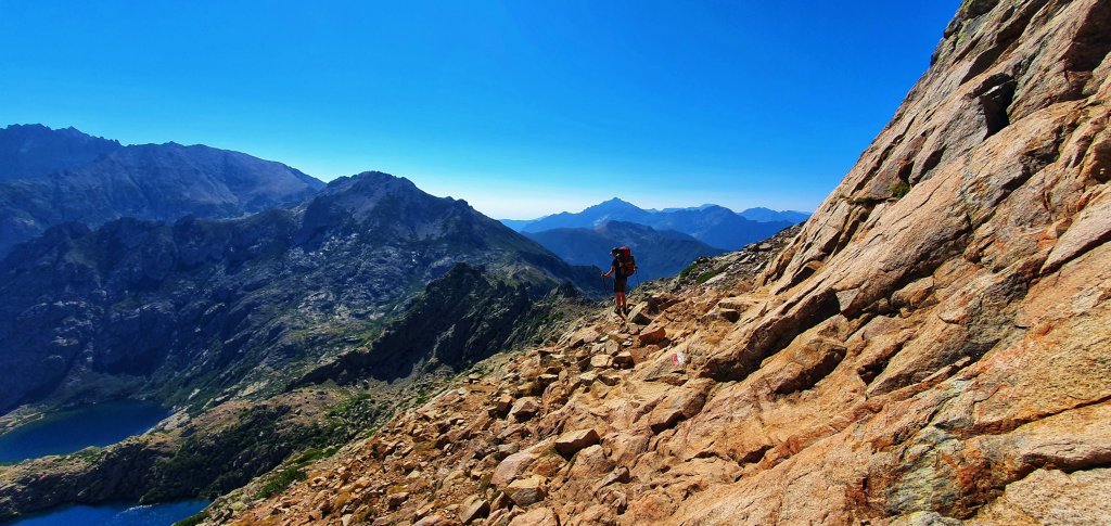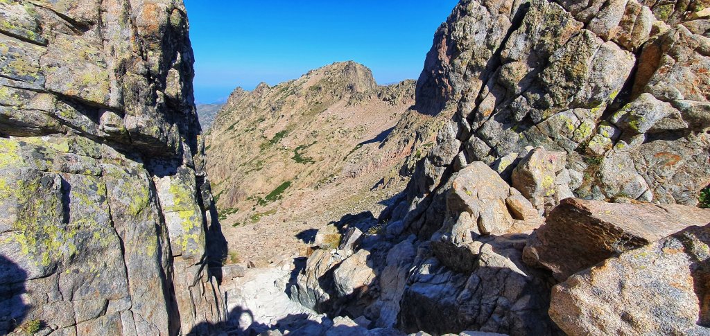 A scrambly passage to the right leads us to a high ridge with amazing views down the Restonica Valley to the left.