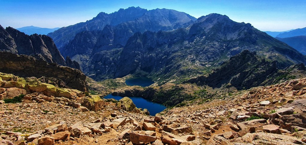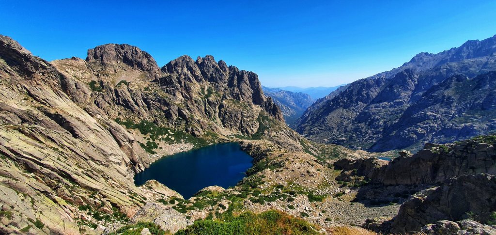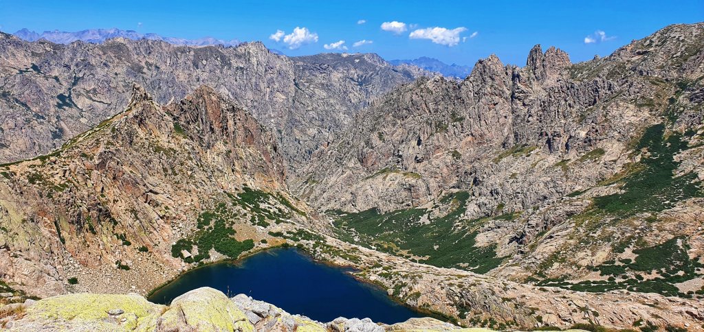 Far beneath us lie the crater lakes Lac de Capitellu and Lac du Melo. Its very beautiful here absolutely stunning. These lakes have glacial origin. Their isolated location is special.