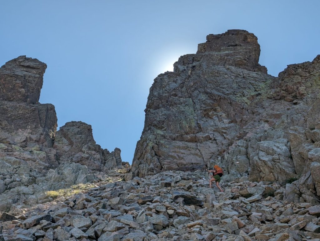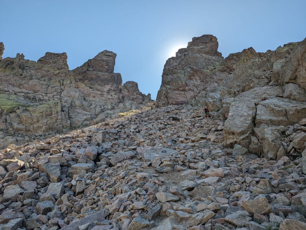 The climb is very steep and relentless the whole way (of course it was). The final scree slope holds snow well into the summer, but not today.