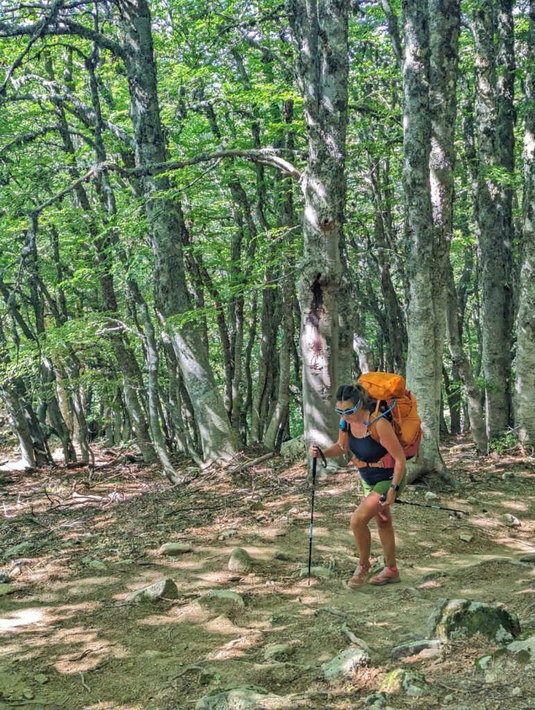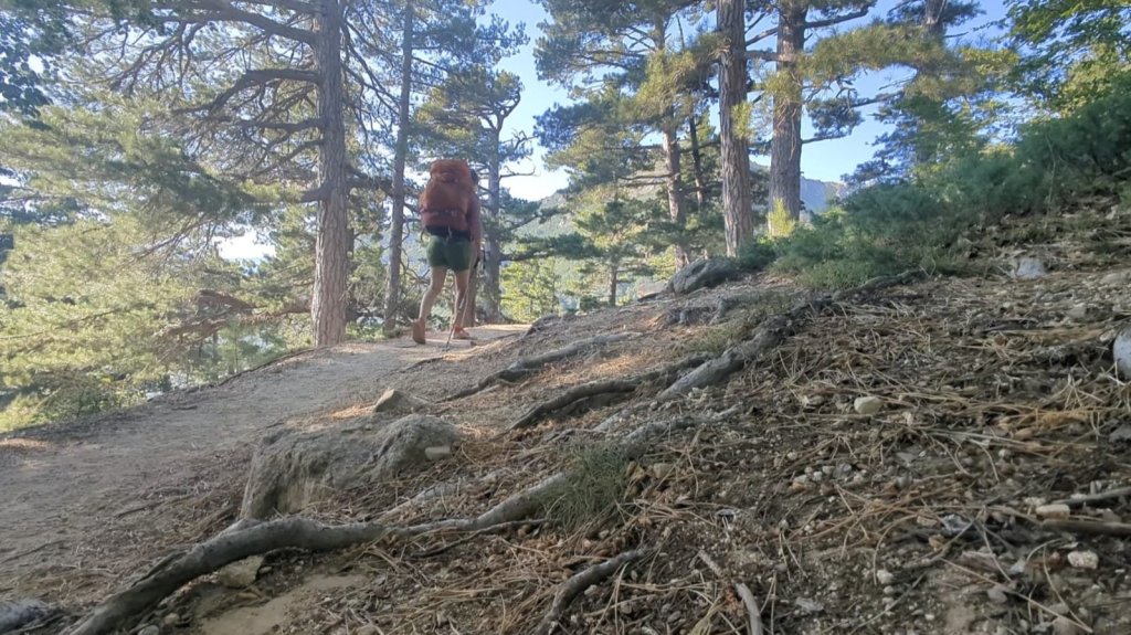 The route traverses forested slopes for most of the day. Although there are some steep and rugged ascents and descents, these are quite short, and most of the time the gradients are gentle in comparison to other days and the paths and tracks followed are fairly easy – again in comparison to other days!